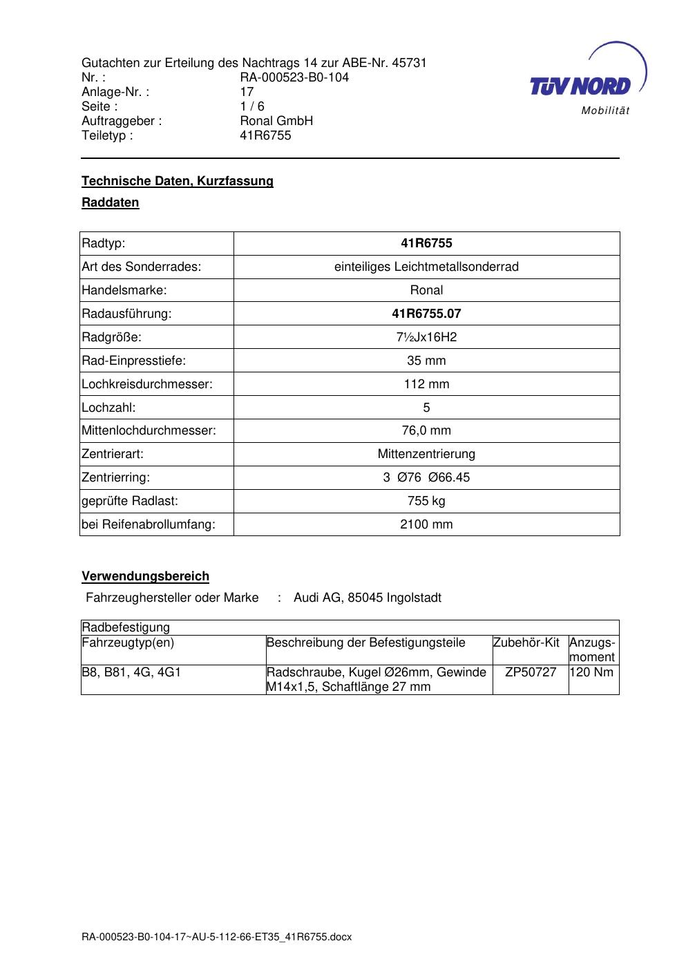 Dieses Gutachten (abe) bezieht sich auf die Alufelge brand-ronal 41R6755 in der Ausführung ET 0, Mittenloch 0 mm (KBA 45731). Im PDF findest du typischerweise zulässige Reifengrößen, Auflagen/Anbauhinweise und – je nach Dokument – Hinweise zur Eintragung.