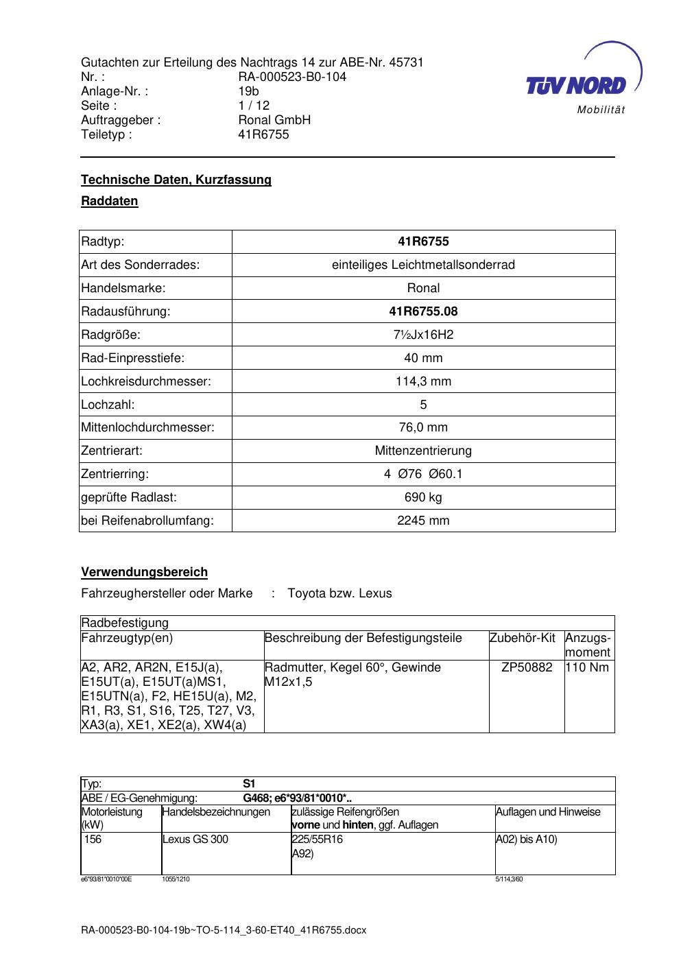 Dieses Gutachten (abe) bezieht sich auf die Alufelge brand-ronal 41R6755 in der Ausführung ET 0, Mittenloch 0 mm (KBA 45731). Im PDF findest du typischerweise zulässige Reifengrößen, Auflagen/Anbauhinweise und – je nach Dokument – Hinweise zur Eintragung.