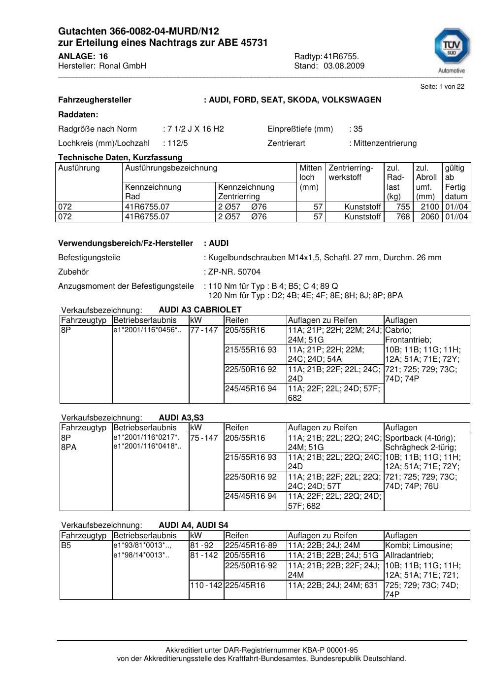 Dieses Gutachten (abe) bezieht sich auf die Alufelge Ronal 41R6755 in der Ausführung 2Jx16 ET 0, Mittenloch 0 mm (KBA 45731). Im PDF findest du typischerweise zulässige Reifengrößen, Auflagen/Anbauhinweise und – je nach Dokument – Hinweise zur Eintragung.