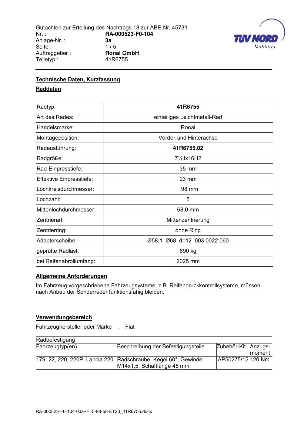 Dieses Gutachten (abe) bezieht sich auf die Alufelge brand-ronal 41R6755 in der Ausführung ET 0, Mittenloch 0 mm (KBA 45731). Im PDF findest du typischerweise zulässige Reifengrößen, Auflagen/Anbauhinweise und – je nach Dokument – Hinweise zur Eintragung.