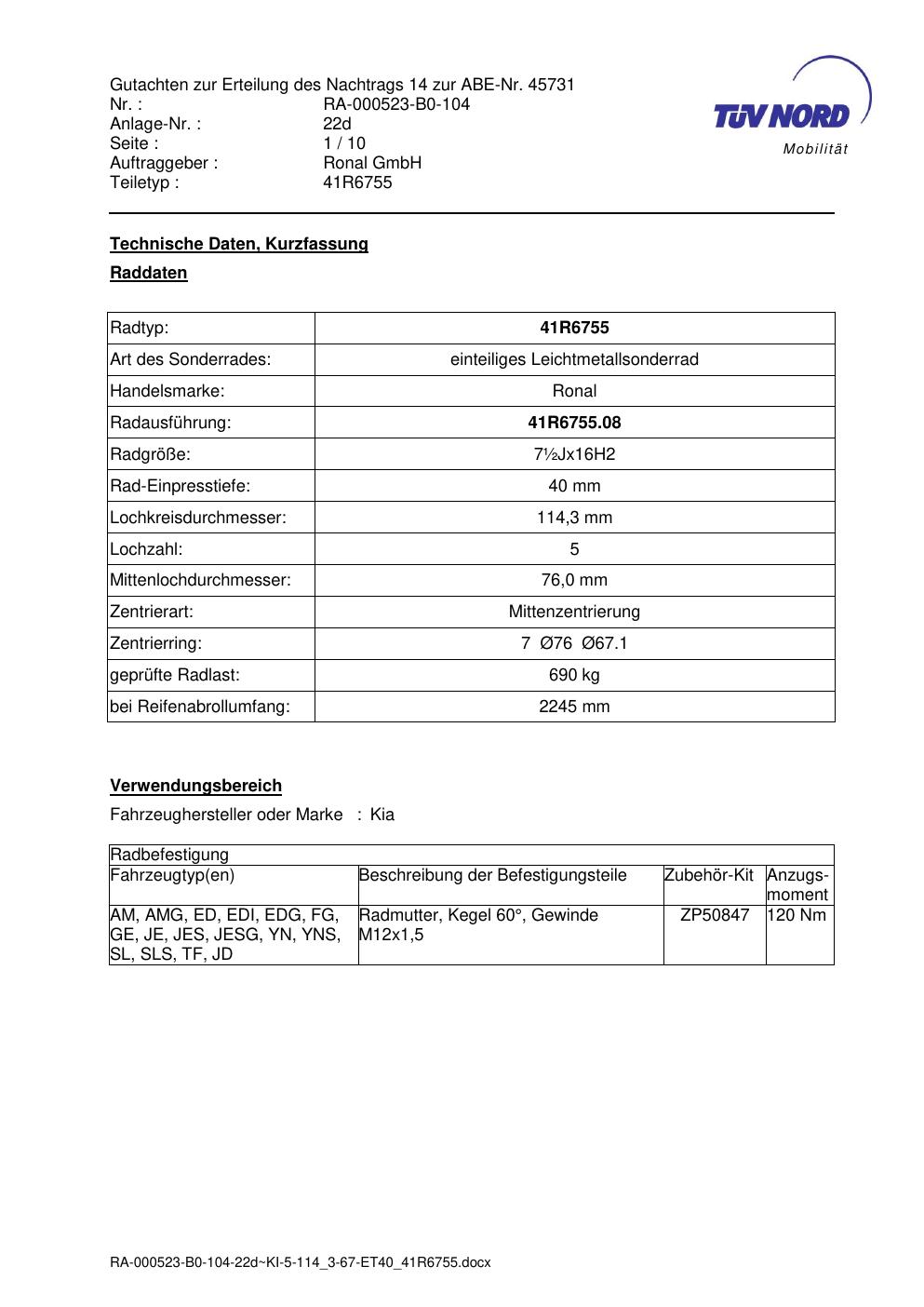 Dieses Gutachten (abe) bezieht sich auf die Alufelge brand-ronal 41R6755 in der Ausführung ET 0, Mittenloch 0 mm (KBA 45731). Im PDF findest du typischerweise zulässige Reifengrößen, Auflagen/Anbauhinweise und – je nach Dokument – Hinweise zur Eintragung.