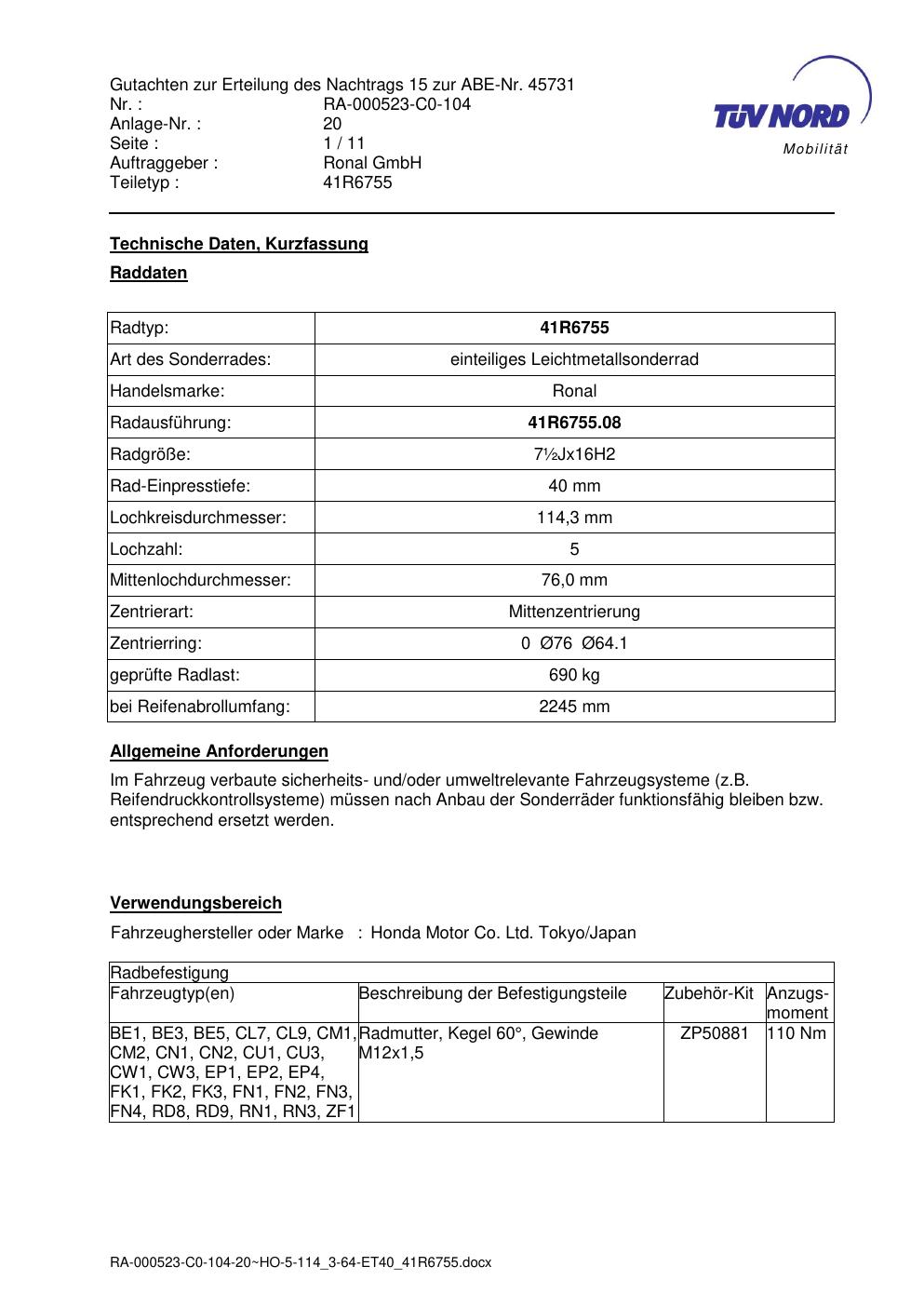 Dieses Gutachten (abe) bezieht sich auf die Alufelge brand-ronal 41R6755 in der Ausführung ET 0, Mittenloch 0 mm (KBA 45731). Im PDF findest du typischerweise zulässige Reifengrößen, Auflagen/Anbauhinweise und – je nach Dokument – Hinweise zur Eintragung.