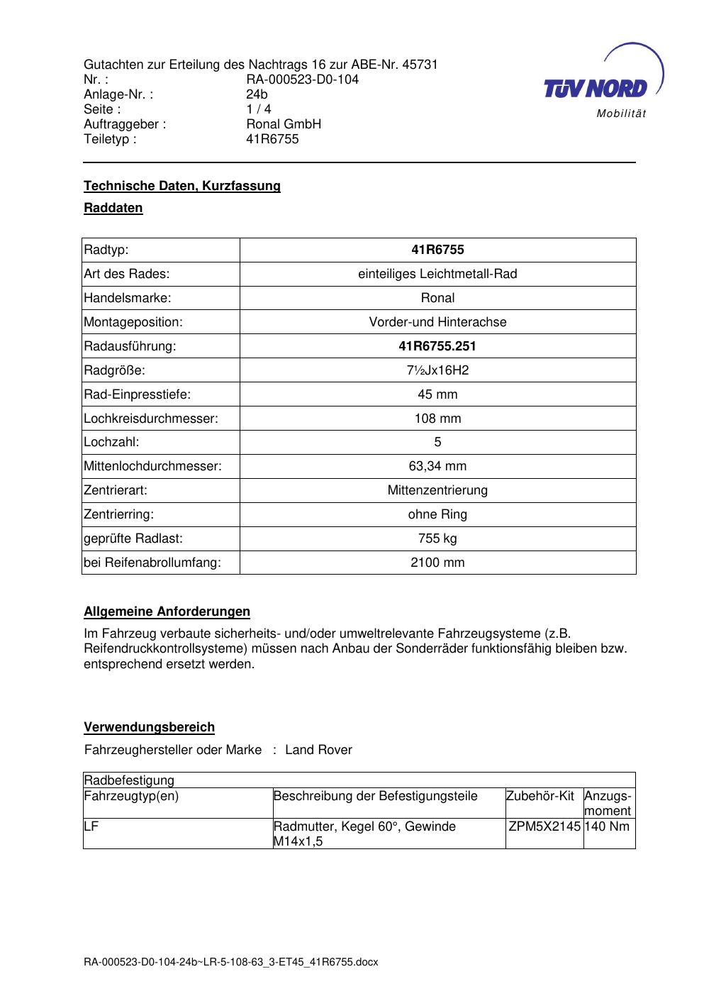 Dieses Gutachten (abe) bezieht sich auf die Alufelge brand-ronal 41R6755 in der Ausführung ET 0, Mittenloch 0 mm (KBA 45731). Im PDF findest du typischerweise zulässige Reifengrößen, Auflagen/Anbauhinweise und – je nach Dokument – Hinweise zur Eintragung.