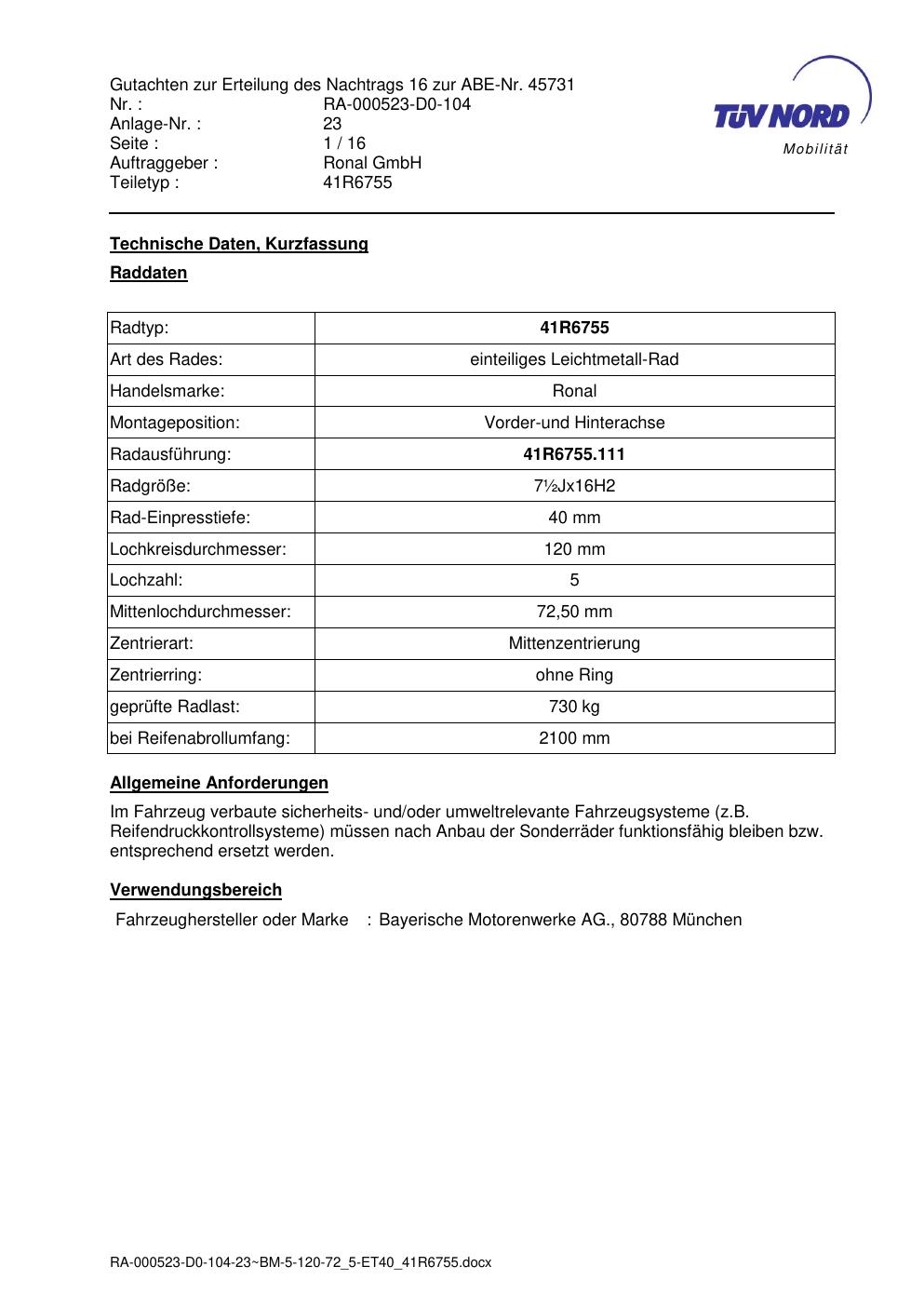 Dieses Gutachten (abe) bezieht sich auf die Alufelge brand-ronal 41R6755 in der Ausführung ET 0, Mittenloch 0 mm (KBA 45731). Im PDF findest du typischerweise zulässige Reifengrößen, Auflagen/Anbauhinweise und – je nach Dokument – Hinweise zur Eintragung.