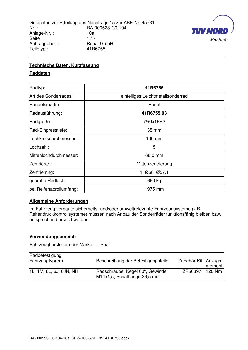 Dieses Gutachten (abe) bezieht sich auf die Alufelge brand-ronal 41R6755 in der Ausführung ET 0, Mittenloch 0 mm (KBA 45731). Im PDF findest du typischerweise zulässige Reifengrößen, Auflagen/Anbauhinweise und – je nach Dokument – Hinweise zur Eintragung.