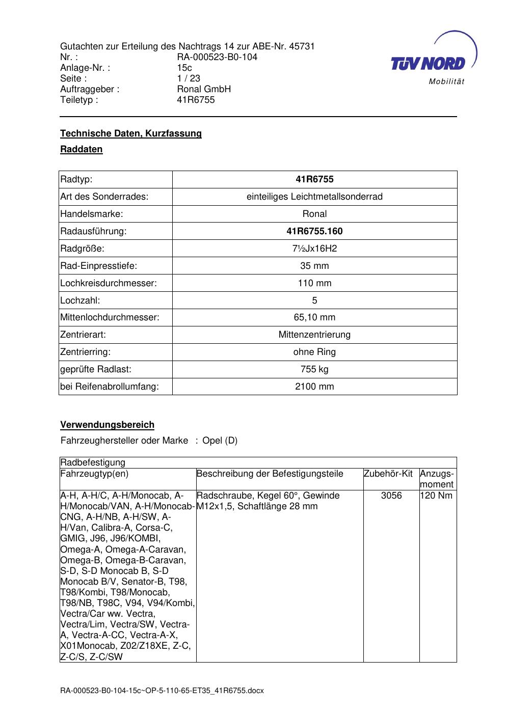 Dieses Gutachten (abe) bezieht sich auf die Alufelge brand-ronal 41R6755 in der Ausführung ET 0, Mittenloch 0 mm (KBA 45731). Im PDF findest du typischerweise zulässige Reifengrößen, Auflagen/Anbauhinweise und – je nach Dokument – Hinweise zur Eintragung.
