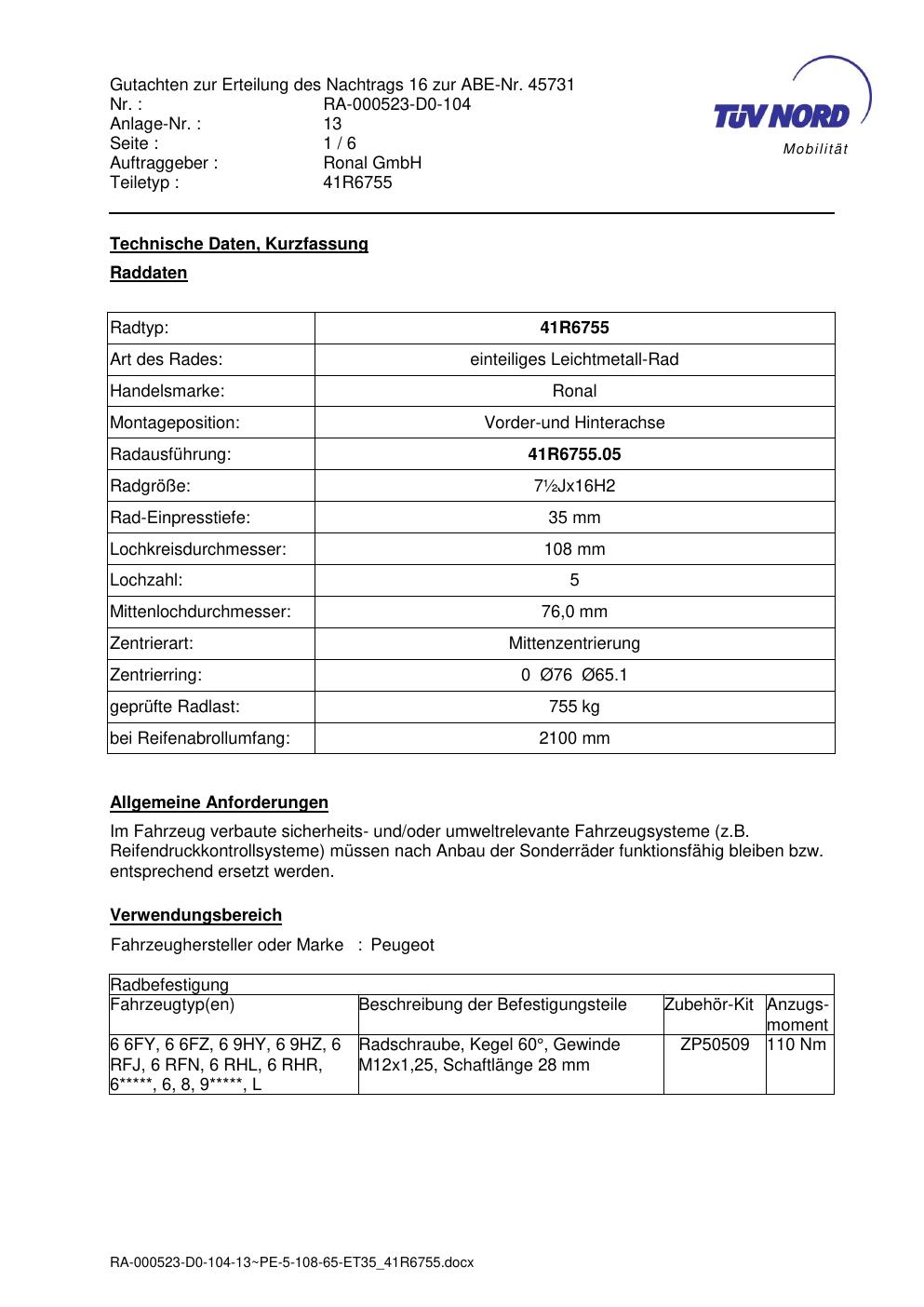 Dieses Gutachten (abe) bezieht sich auf die Alufelge brand-ronal 41R6755 in der Ausführung ET 0, Mittenloch 0 mm (KBA 45731). Im PDF findest du typischerweise zulässige Reifengrößen, Auflagen/Anbauhinweise und – je nach Dokument – Hinweise zur Eintragung.