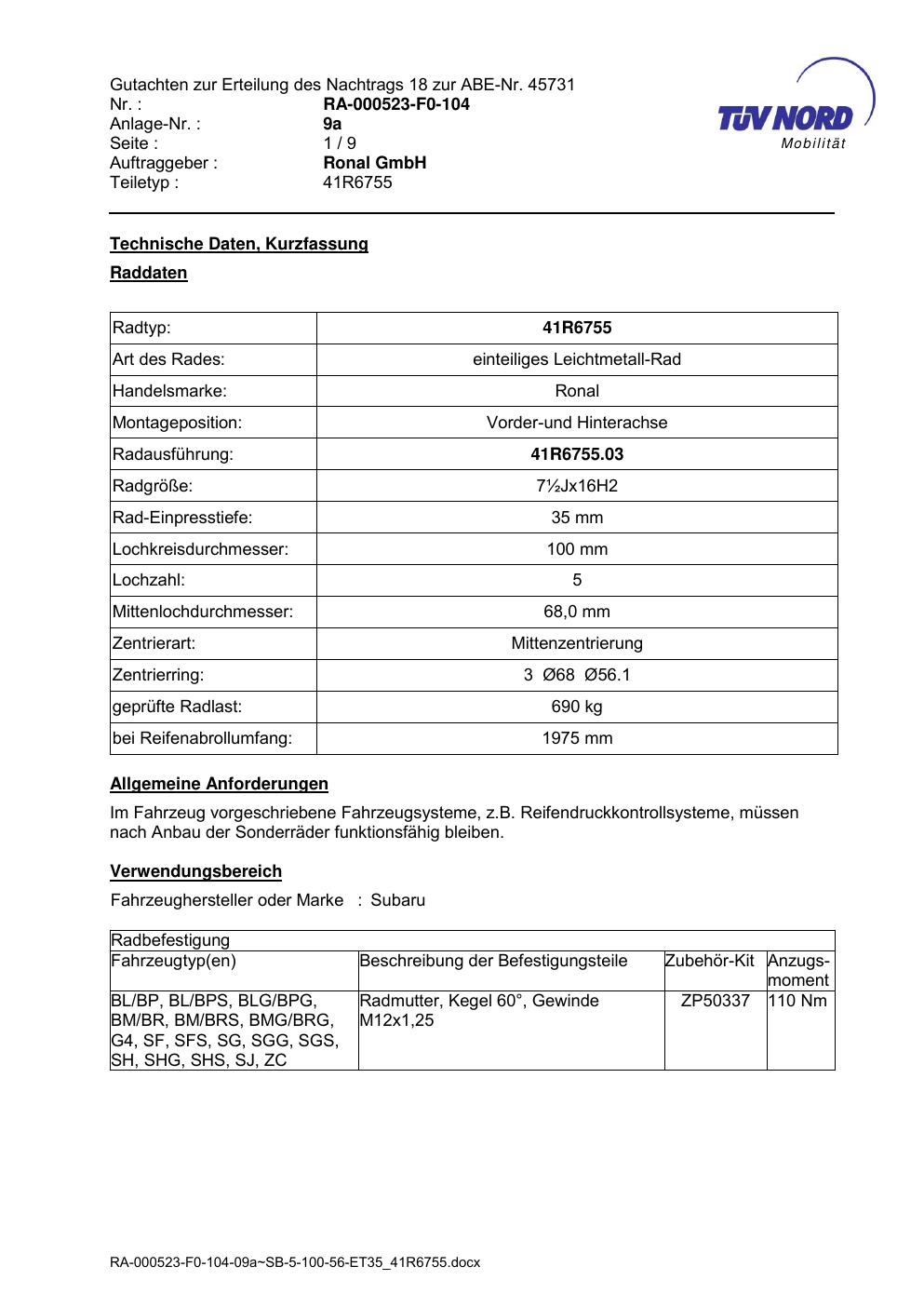 Dieses Gutachten (abe) bezieht sich auf die Alufelge brand-ronal 41R6755 in der Ausführung ET 0, Mittenloch 0 mm (KBA 45731). Im PDF findest du typischerweise zulässige Reifengrößen, Auflagen/Anbauhinweise und – je nach Dokument – Hinweise zur Eintragung.