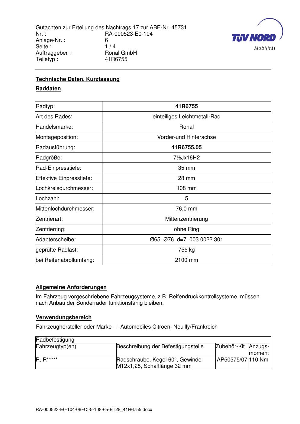 Dieses Gutachten (abe) bezieht sich auf die Alufelge brand-ronal 41R6755 in der Ausführung ET 0, Mittenloch 0 mm (KBA 45731). Im PDF findest du typischerweise zulässige Reifengrößen, Auflagen/Anbauhinweise und – je nach Dokument – Hinweise zur Eintragung.