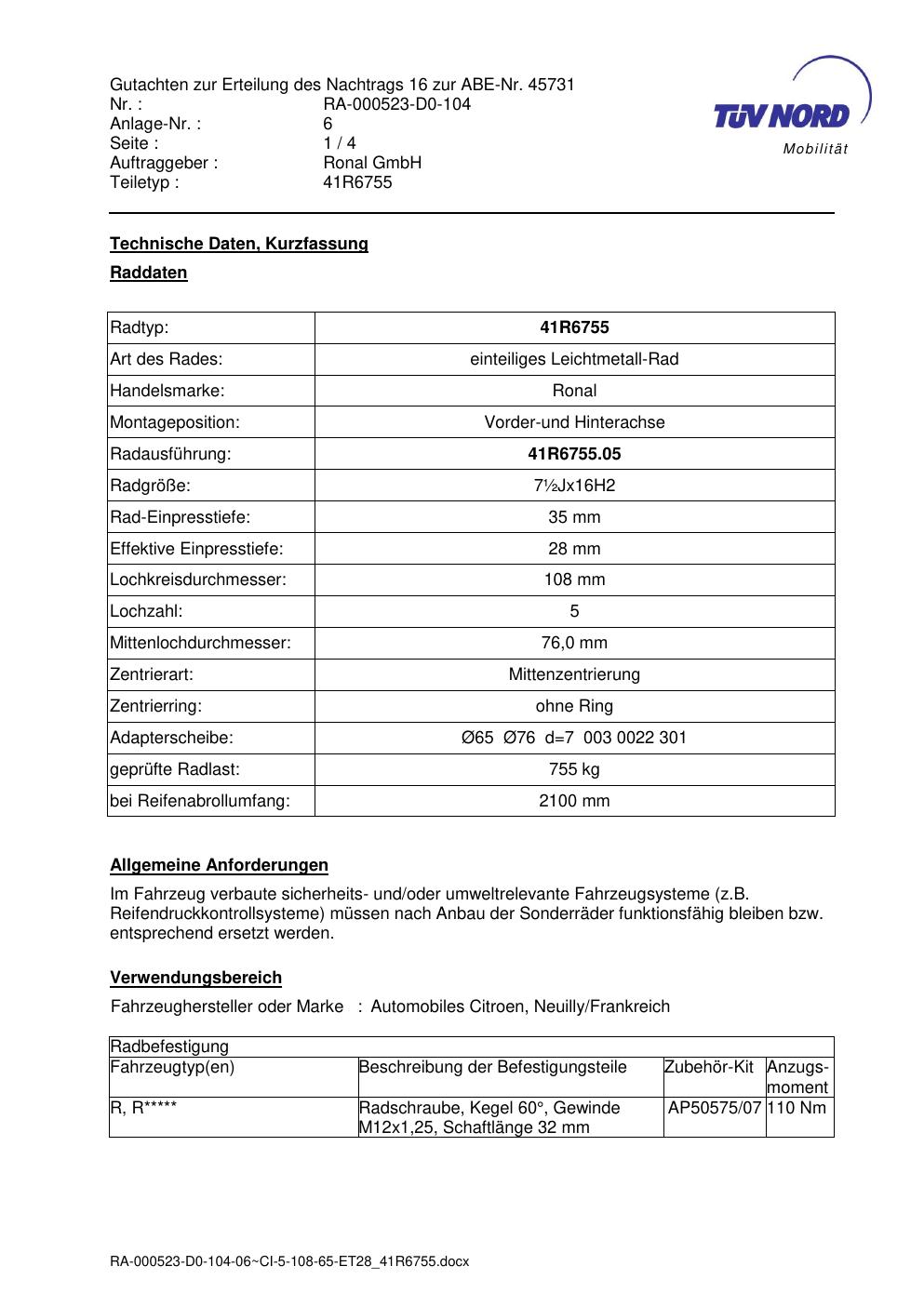 Dieses Gutachten (abe) bezieht sich auf die Alufelge brand-ronal 41R6755 in der Ausführung ET 0, Mittenloch 0 mm (KBA 45731). Im PDF findest du typischerweise zulässige Reifengrößen, Auflagen/Anbauhinweise und – je nach Dokument – Hinweise zur Eintragung.