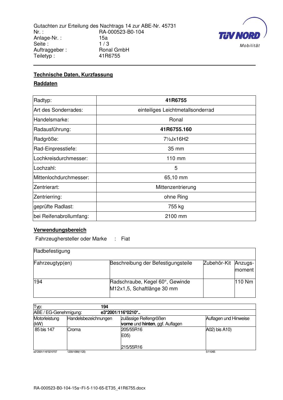 Dieses Gutachten (abe) bezieht sich auf die Alufelge brand-ronal 41R6755 in der Ausführung ET 0, Mittenloch 0 mm (KBA 45731). Im PDF findest du typischerweise zulässige Reifengrößen, Auflagen/Anbauhinweise und – je nach Dokument – Hinweise zur Eintragung.