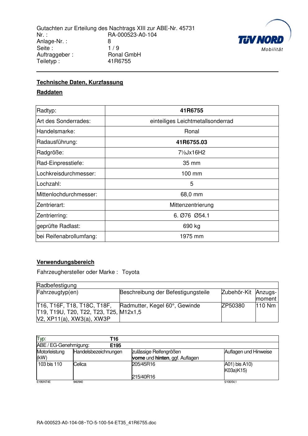 Dieses Gutachten (abe) bezieht sich auf die Alufelge brand-ronal 41R6755 in der Ausführung ET 0, Mittenloch 0 mm (KBA 45731). Im PDF findest du typischerweise zulässige Reifengrößen, Auflagen/Anbauhinweise und – je nach Dokument – Hinweise zur Eintragung.