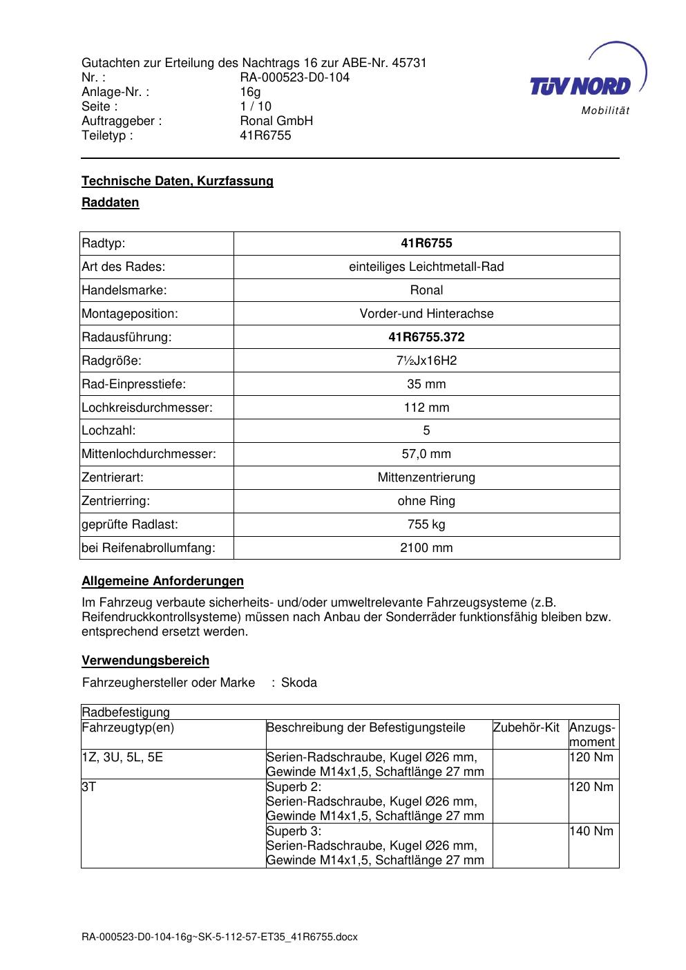 Dieses Gutachten (abe) bezieht sich auf die Alufelge brand-ronal 41R6755 in der Ausführung ET 0, Mittenloch 0 mm (KBA 45731). Im PDF findest du typischerweise zulässige Reifengrößen, Auflagen/Anbauhinweise und – je nach Dokument – Hinweise zur Eintragung.