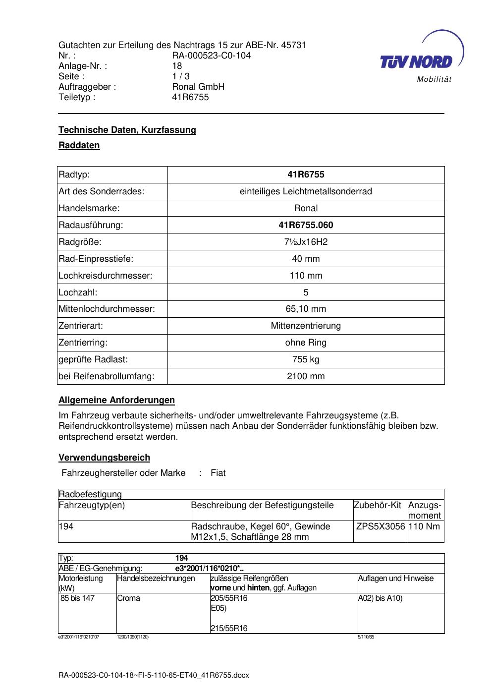 Dieses Gutachten (abe) bezieht sich auf die Alufelge brand-ronal 41R6755 in der Ausführung ET 0, Mittenloch 0 mm (KBA 45731). Im PDF findest du typischerweise zulässige Reifengrößen, Auflagen/Anbauhinweise und – je nach Dokument – Hinweise zur Eintragung.