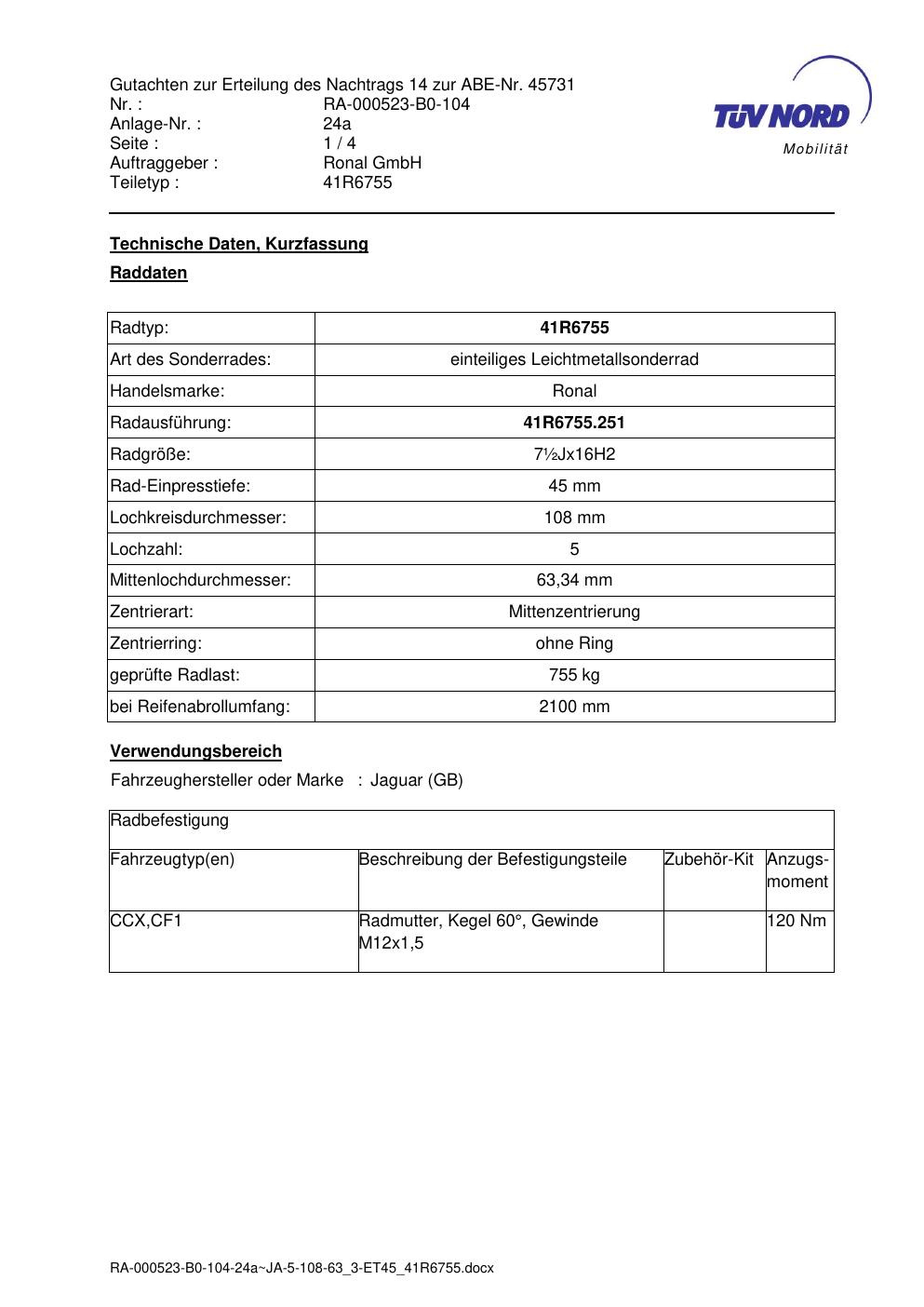 Dieses Gutachten (abe) bezieht sich auf die Alufelge brand-ronal 41R6755 in der Ausführung ET 0, Mittenloch 0 mm (KBA 45731). Im PDF findest du typischerweise zulässige Reifengrößen, Auflagen/Anbauhinweise und – je nach Dokument – Hinweise zur Eintragung.