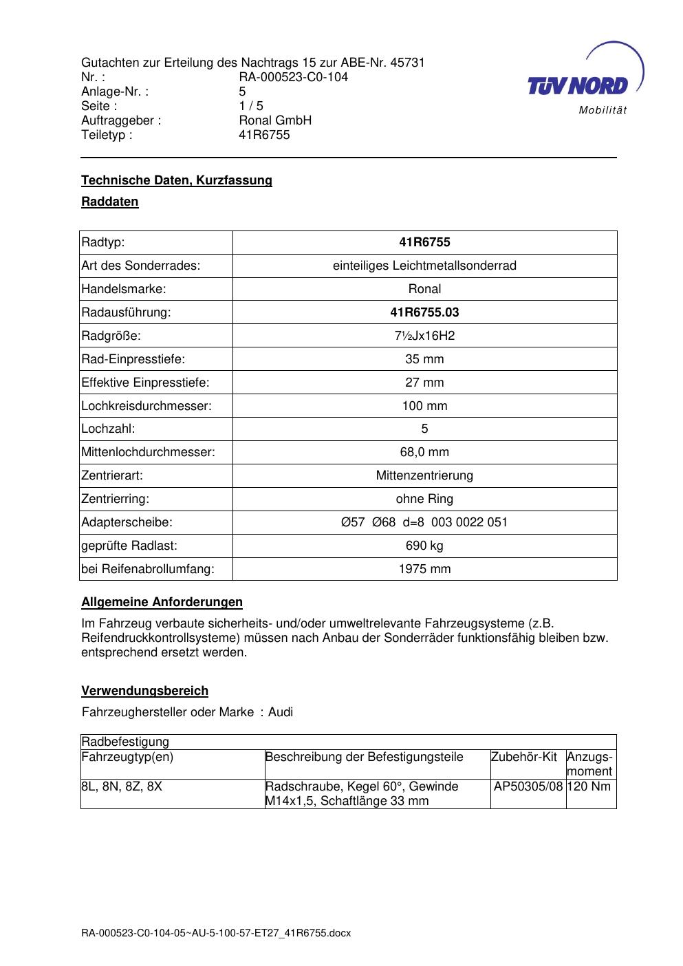 Dieses Gutachten (abe) bezieht sich auf die Alufelge brand-ronal 41R6755 in der Ausführung ET 0, Mittenloch 0 mm (KBA 45731). Im PDF findest du typischerweise zulässige Reifengrößen, Auflagen/Anbauhinweise und – je nach Dokument – Hinweise zur Eintragung.