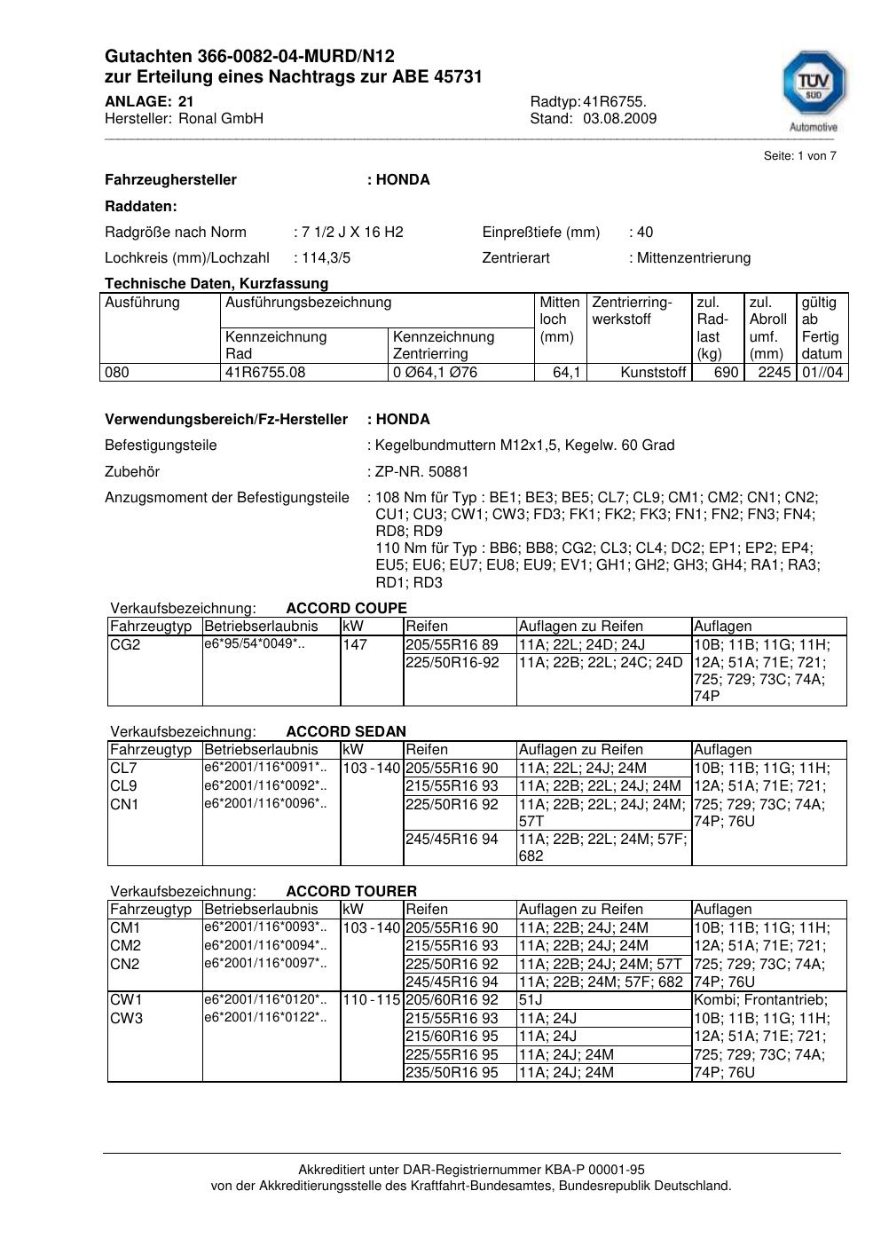 Dieses Gutachten (abe) bezieht sich auf die Alufelge Ronal 41R6755 in der Ausführung 2Jx16 ET 0, Mittenloch 0 mm (KBA 45731). Im PDF findest du typischerweise zulässige Reifengrößen, Auflagen/Anbauhinweise und – je nach Dokument – Hinweise zur Eintragung.