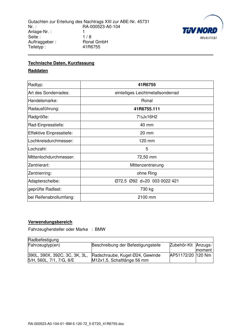 Dieses Gutachten (abe) bezieht sich auf die Alufelge brand-ronal 41R6755 in der Ausführung ET 0, Mittenloch 0 mm (KBA 45731). Im PDF findest du typischerweise zulässige Reifengrößen, Auflagen/Anbauhinweise und – je nach Dokument – Hinweise zur Eintragung.
