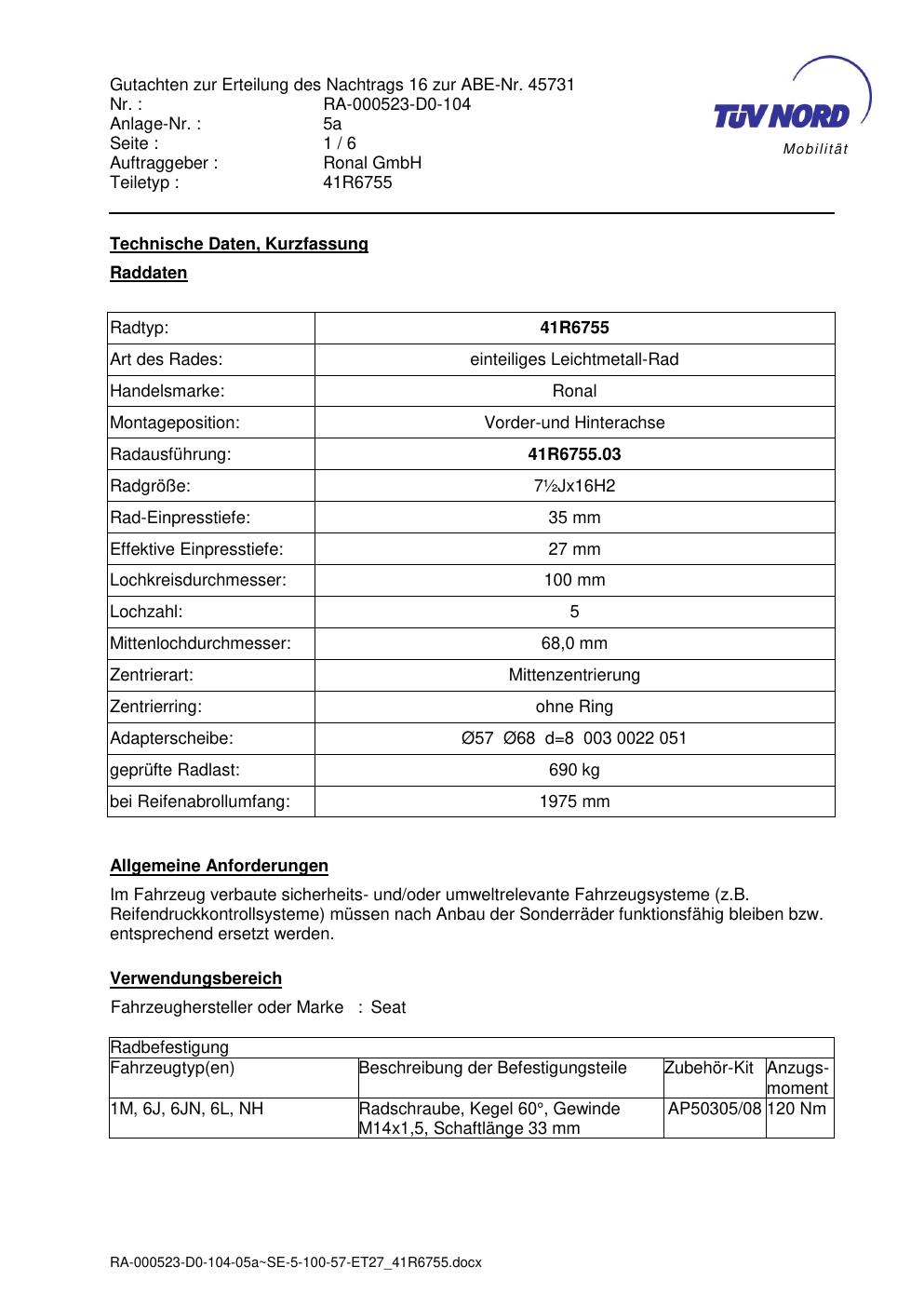 Dieses Gutachten (abe) bezieht sich auf die Alufelge brand-ronal 41R6755 in der Ausführung ET 0, Mittenloch 0 mm (KBA 45731). Im PDF findest du typischerweise zulässige Reifengrößen, Auflagen/Anbauhinweise und – je nach Dokument – Hinweise zur Eintragung.