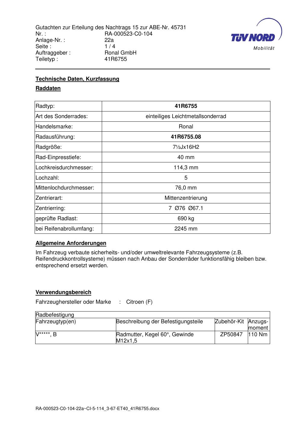 Dieses Gutachten (abe) bezieht sich auf die Alufelge brand-ronal 41R6755 in der Ausführung ET 0, Mittenloch 0 mm (KBA 45731). Im PDF findest du typischerweise zulässige Reifengrößen, Auflagen/Anbauhinweise und – je nach Dokument – Hinweise zur Eintragung.