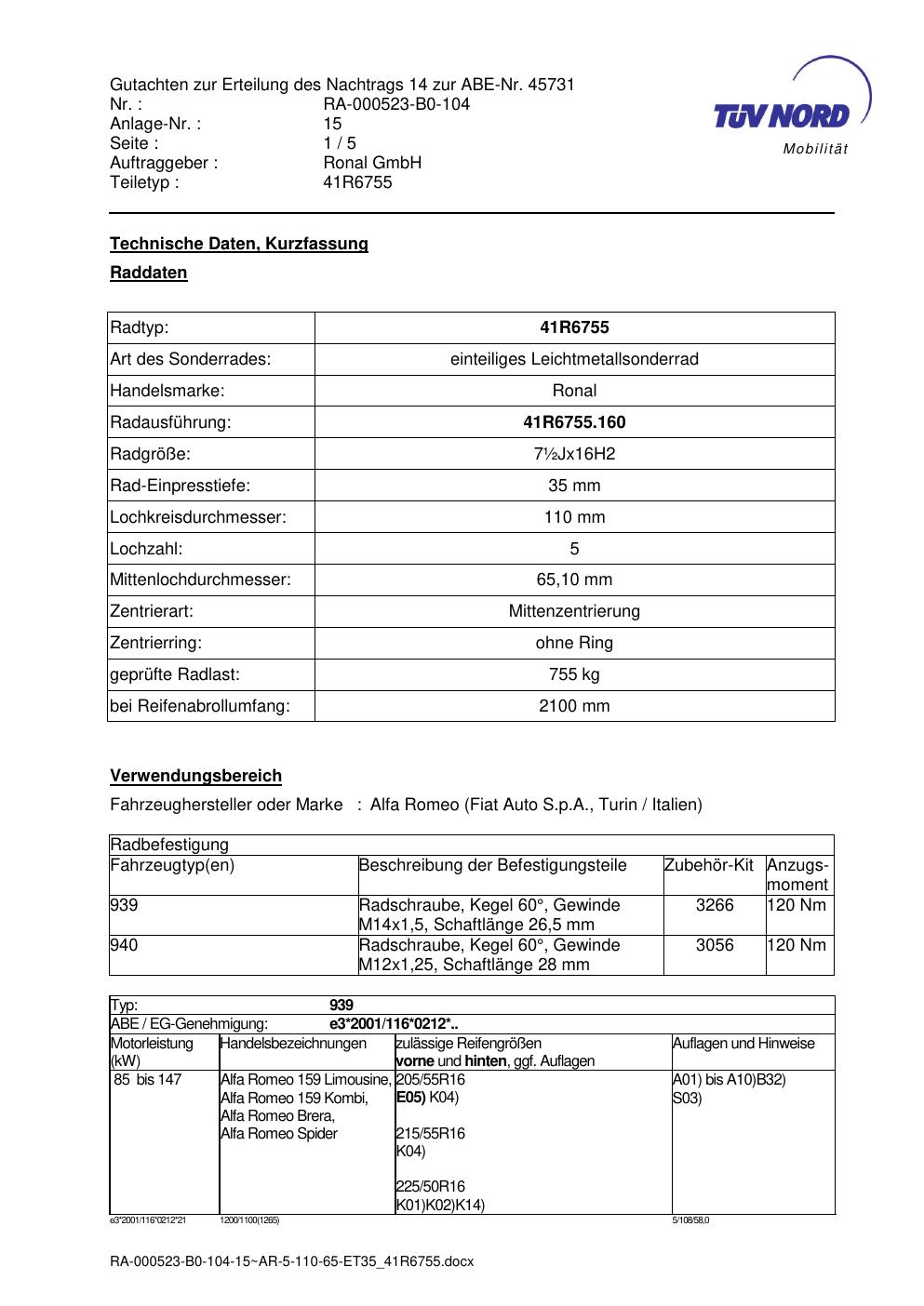 Dieses Gutachten (abe) bezieht sich auf die Alufelge brand-ronal 41R6755 in der Ausführung ET 0, Mittenloch 0 mm (KBA 45731). Im PDF findest du typischerweise zulässige Reifengrößen, Auflagen/Anbauhinweise und – je nach Dokument – Hinweise zur Eintragung.