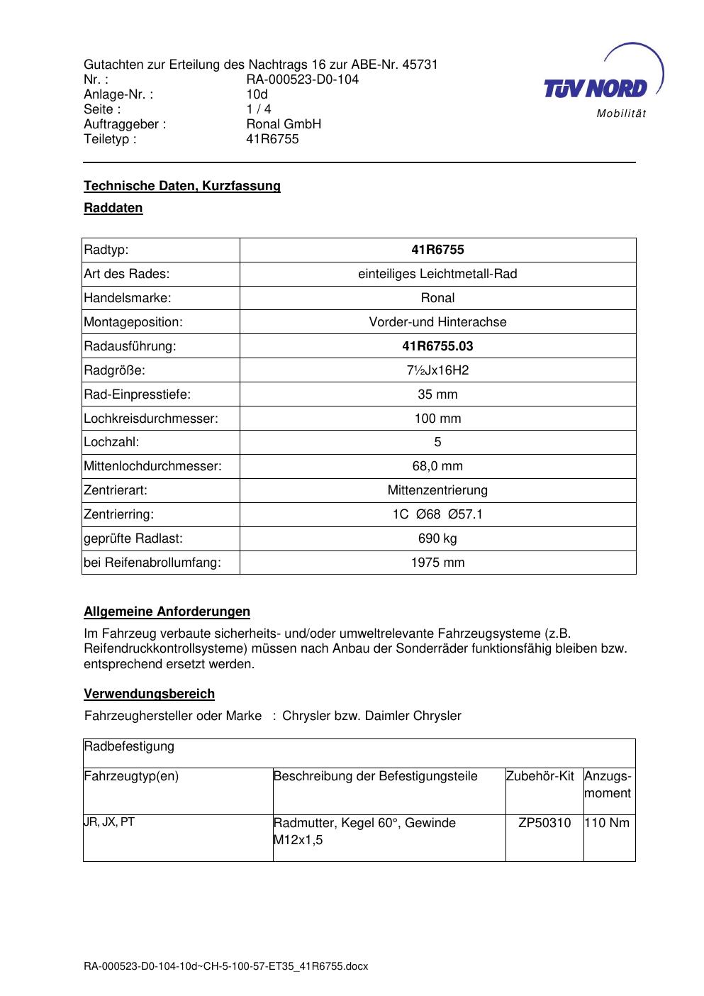 Dieses Gutachten (abe) bezieht sich auf die Alufelge brand-ronal 41R6755 in der Ausführung ET 0, Mittenloch 0 mm (KBA 45731). Im PDF findest du typischerweise zulässige Reifengrößen, Auflagen/Anbauhinweise und – je nach Dokument – Hinweise zur Eintragung.