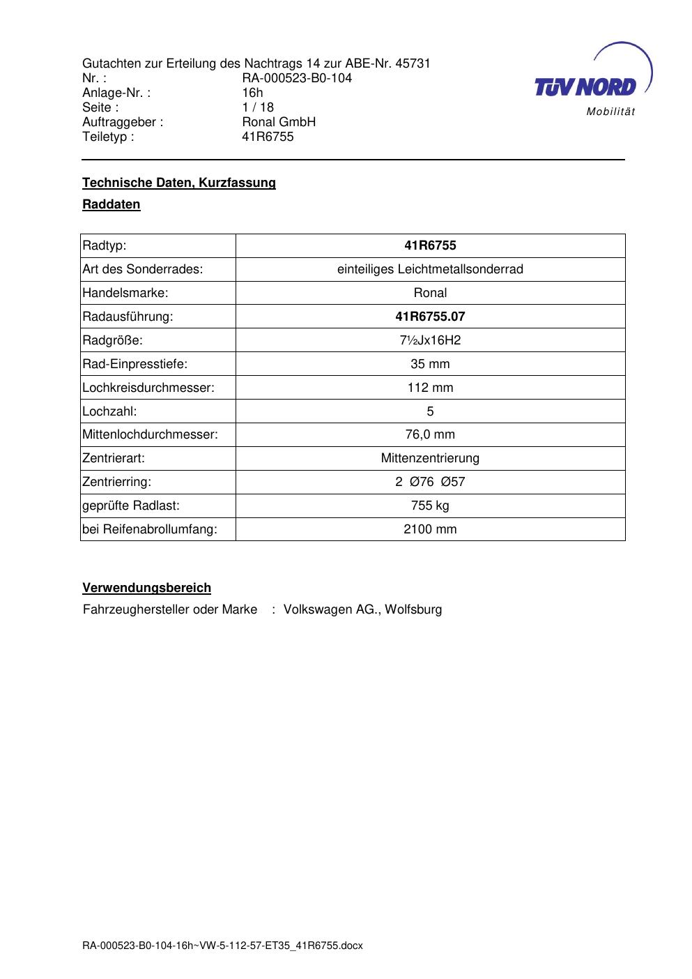 Dieses Gutachten (abe) bezieht sich auf die Alufelge brand-ronal 41R6755 in der Ausführung ET 0, Mittenloch 0 mm (KBA 45731). Im PDF findest du typischerweise zulässige Reifengrößen, Auflagen/Anbauhinweise und – je nach Dokument – Hinweise zur Eintragung.