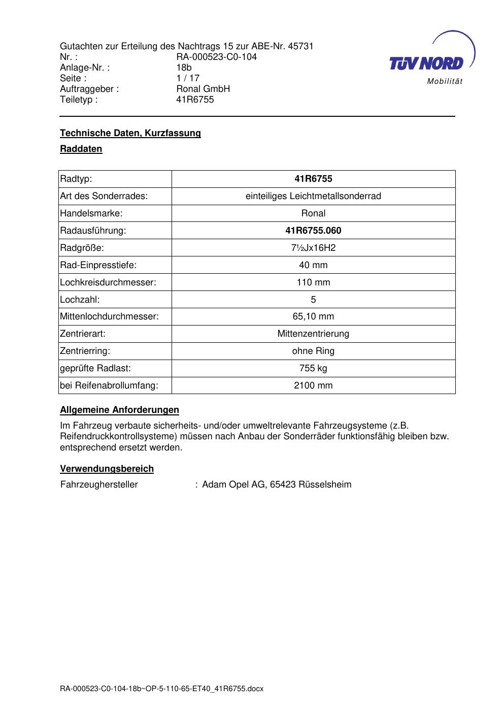 Dieses Gutachten (abe) bezieht sich auf die Alufelge brand-ronal 41R6755 in der Ausführung ET 0, Mittenloch 0 mm (KBA 45731). Im PDF findest du typischerweise zulässige Reifengrößen, Auflagen/Anbauhinweise und – je nach Dokument – Hinweise zur Eintragung.