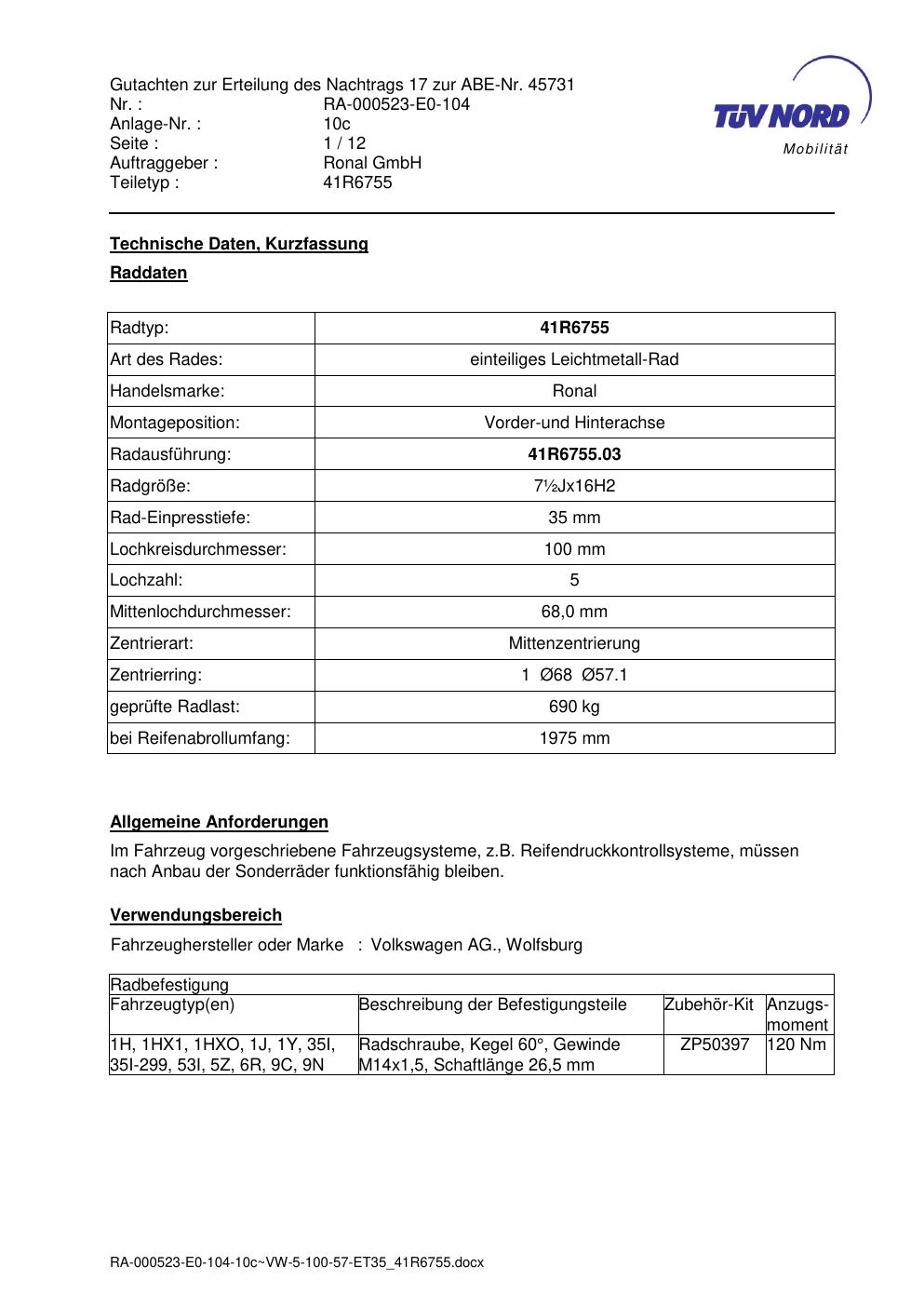 Dieses Gutachten (abe) bezieht sich auf die Alufelge brand-ronal 41R6755 in der Ausführung ET 0, Mittenloch 0 mm (KBA 45731). Im PDF findest du typischerweise zulässige Reifengrößen, Auflagen/Anbauhinweise und – je nach Dokument – Hinweise zur Eintragung.