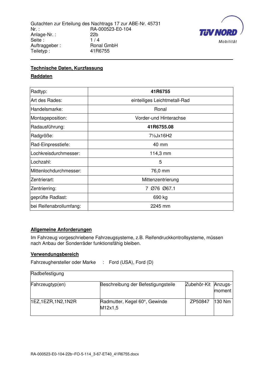 Dieses Gutachten (abe) bezieht sich auf die Alufelge brand-ronal 41R6755 in der Ausführung ET 0, Mittenloch 0 mm (KBA 45731). Im PDF findest du typischerweise zulässige Reifengrößen, Auflagen/Anbauhinweise und – je nach Dokument – Hinweise zur Eintragung.