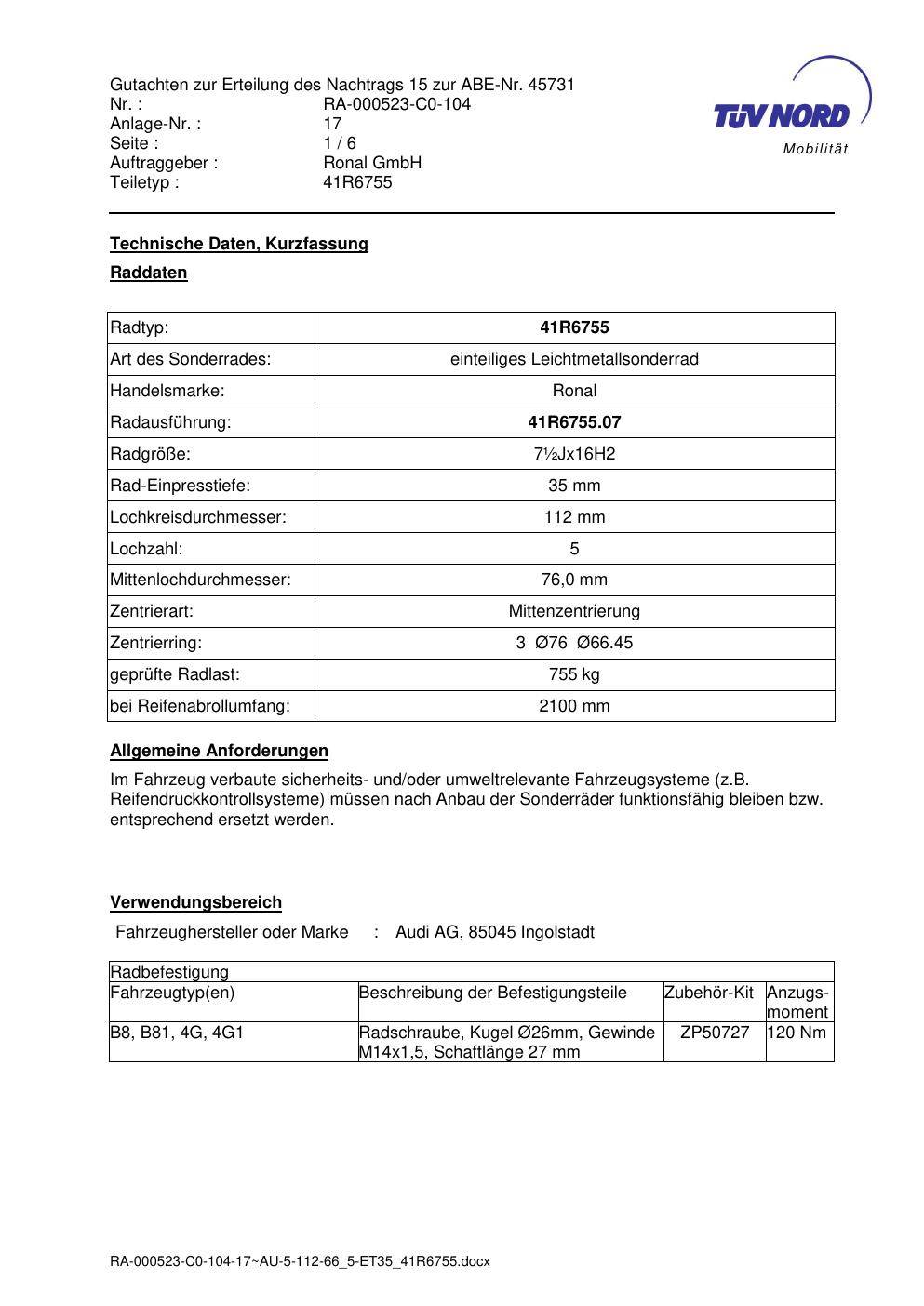 Dieses Gutachten (abe) bezieht sich auf die Alufelge brand-ronal 41R6755 in der Ausführung ET 0, Mittenloch 0 mm (KBA 45731). Im PDF findest du typischerweise zulässige Reifengrößen, Auflagen/Anbauhinweise und – je nach Dokument – Hinweise zur Eintragung.