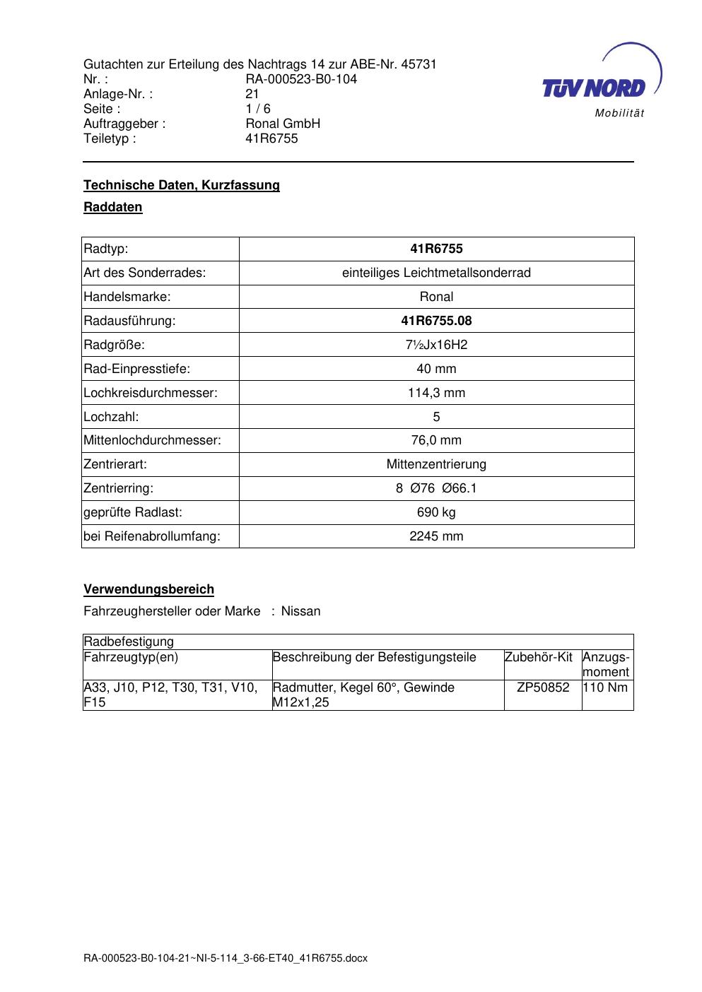 Dieses Gutachten (abe) bezieht sich auf die Alufelge brand-ronal 41R6755 in der Ausführung ET 0, Mittenloch 0 mm (KBA 45731). Im PDF findest du typischerweise zulässige Reifengrößen, Auflagen/Anbauhinweise und – je nach Dokument – Hinweise zur Eintragung.