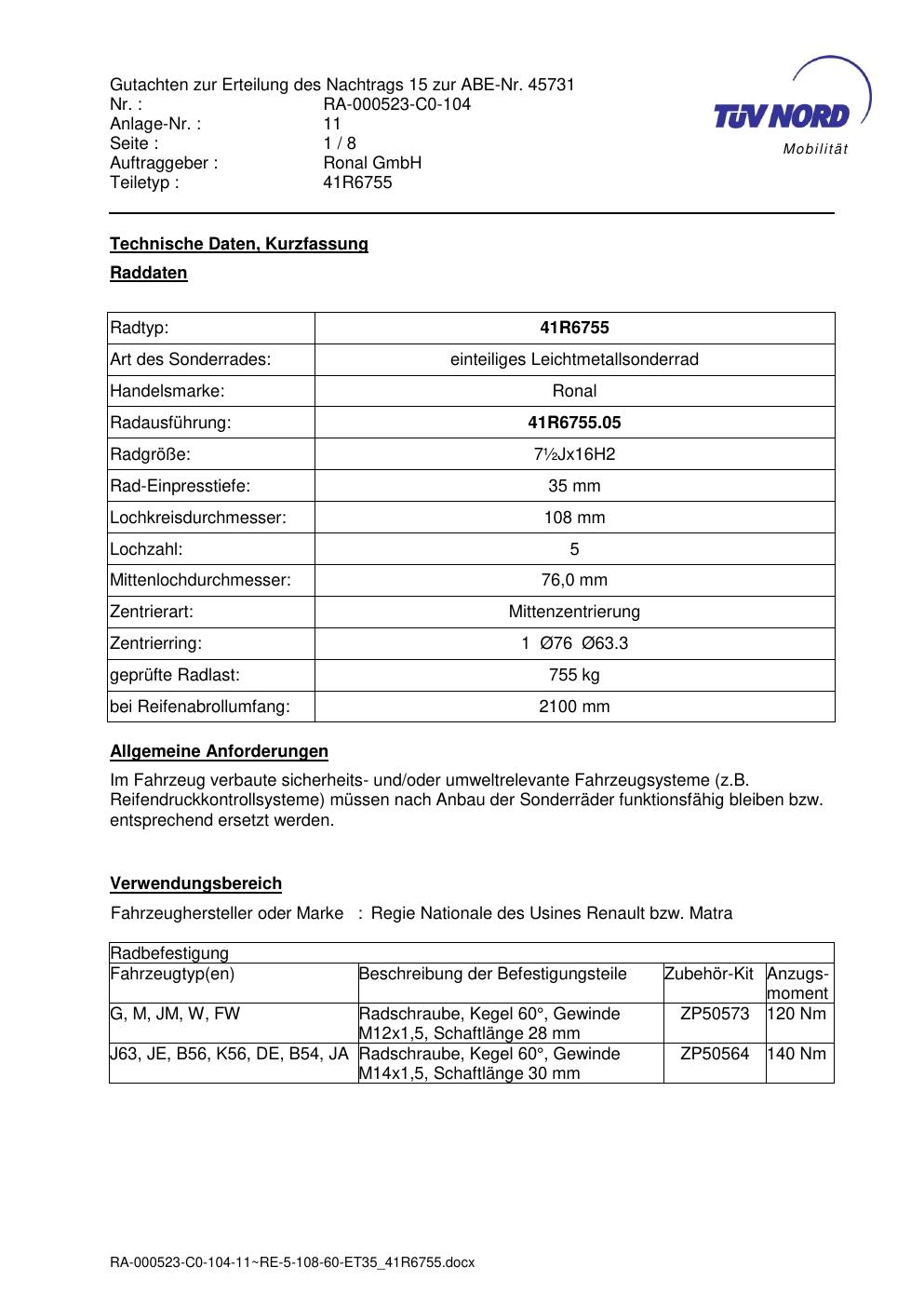 Dieses Gutachten (abe) bezieht sich auf die Alufelge brand-ronal 41R6755 in der Ausführung ET 0, Mittenloch 0 mm (KBA 45731). Im PDF findest du typischerweise zulässige Reifengrößen, Auflagen/Anbauhinweise und – je nach Dokument – Hinweise zur Eintragung.