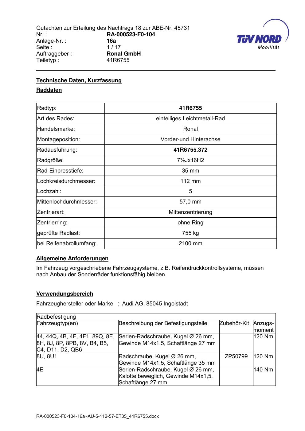 Dieses Gutachten (abe) bezieht sich auf die Alufelge brand-ronal 41R6755 in der Ausführung ET 0, Mittenloch 0 mm (KBA 45731). Im PDF findest du typischerweise zulässige Reifengrößen, Auflagen/Anbauhinweise und – je nach Dokument – Hinweise zur Eintragung.