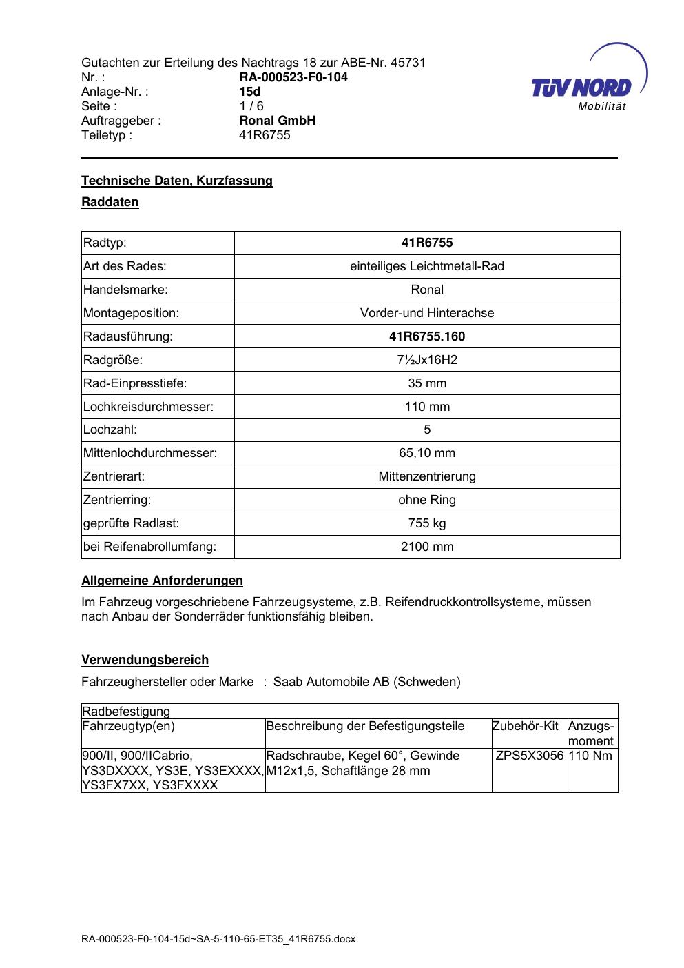 Dieses Gutachten (abe) bezieht sich auf die Alufelge brand-ronal 41R6755 in der Ausführung ET 0, Mittenloch 0 mm (KBA 45731). Im PDF findest du typischerweise zulässige Reifengrößen, Auflagen/Anbauhinweise und – je nach Dokument – Hinweise zur Eintragung.