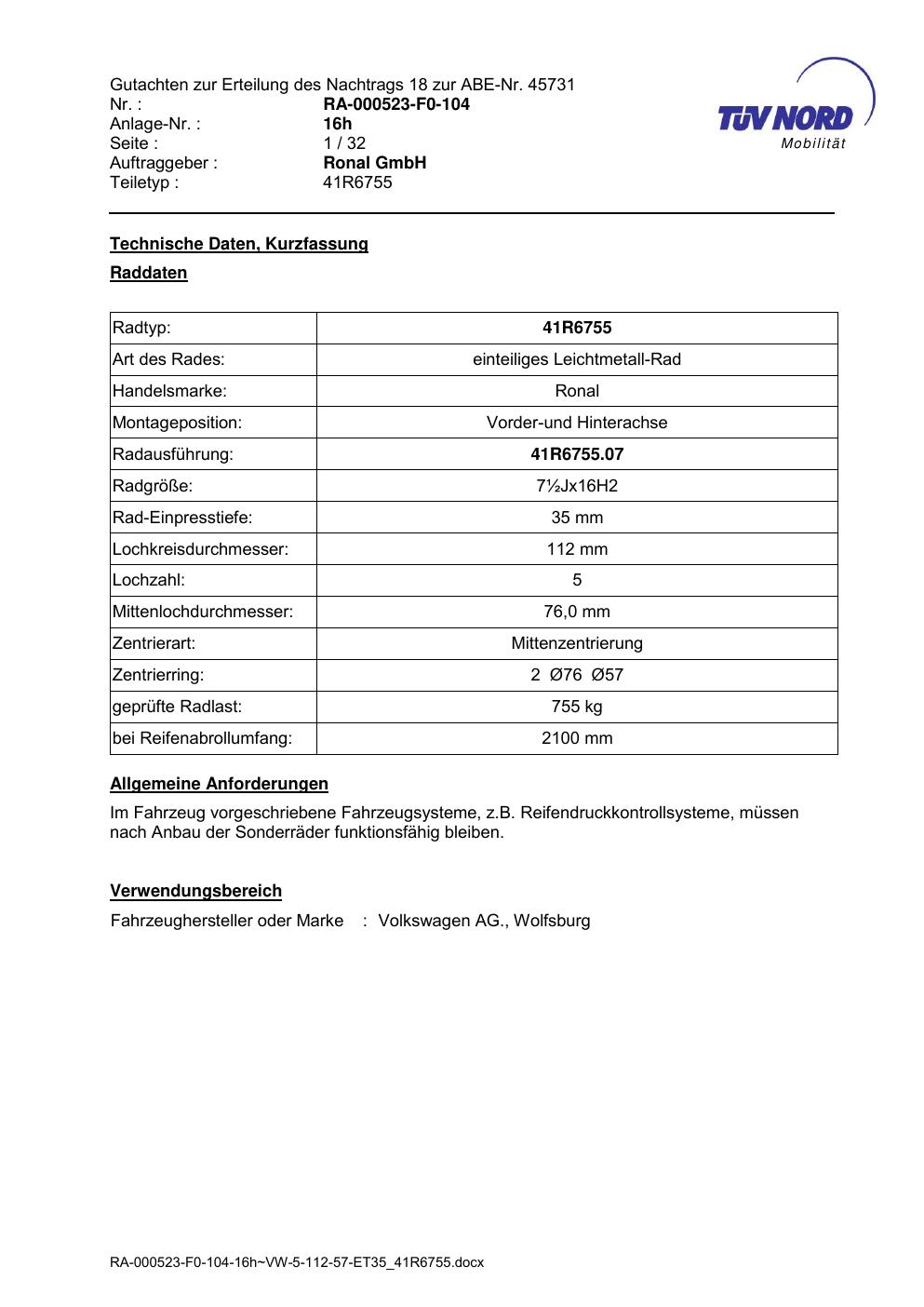 Dieses Gutachten (abe) bezieht sich auf die Alufelge brand-ronal 41R6755 in der Ausführung ET 0, Mittenloch 0 mm (KBA 45731). Im PDF findest du typischerweise zulässige Reifengrößen, Auflagen/Anbauhinweise und – je nach Dokument – Hinweise zur Eintragung.