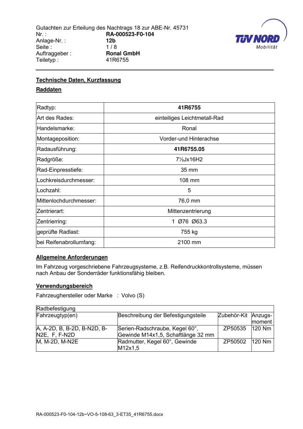 Dieses Gutachten (abe) bezieht sich auf die Alufelge brand-ronal 41R6755 in der Ausführung ET 0, Mittenloch 0 mm (KBA 45731). Im PDF findest du typischerweise zulässige Reifengrößen, Auflagen/Anbauhinweise und – je nach Dokument – Hinweise zur Eintragung.
