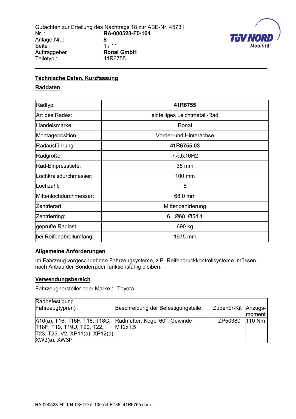 Dieses Gutachten (abe) bezieht sich auf die Alufelge brand-ronal 41R6755 in der Ausführung ET 0, Mittenloch 0 mm (KBA 45731). Im PDF findest du typischerweise zulässige Reifengrößen, Auflagen/Anbauhinweise und – je nach Dokument – Hinweise zur Eintragung.