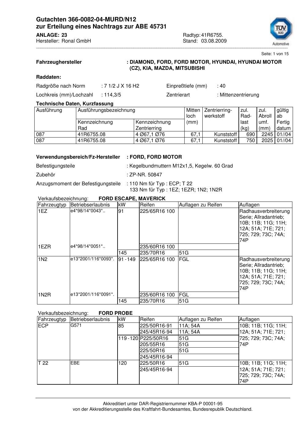 Dieses Gutachten (abe) bezieht sich auf die Alufelge Ronal 41R6755 in der Ausführung 2Jx16 ET 0, Mittenloch 0 mm (KBA 45731). Im PDF findest du typischerweise zulässige Reifengrößen, Auflagen/Anbauhinweise und – je nach Dokument – Hinweise zur Eintragung.