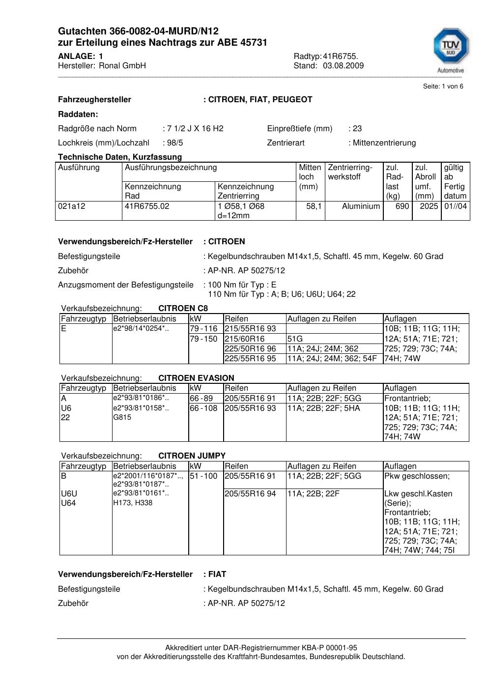 Dieses Gutachten (abe) bezieht sich auf die Alufelge brand-ronal 41R6755 in der Ausführung 2Jx16 ET 0, Mittenloch 0 mm (KBA 45731). Im PDF findest du typischerweise zulässige Reifengrößen, Auflagen/Anbauhinweise und – je nach Dokument – Hinweise zur Eintragung.