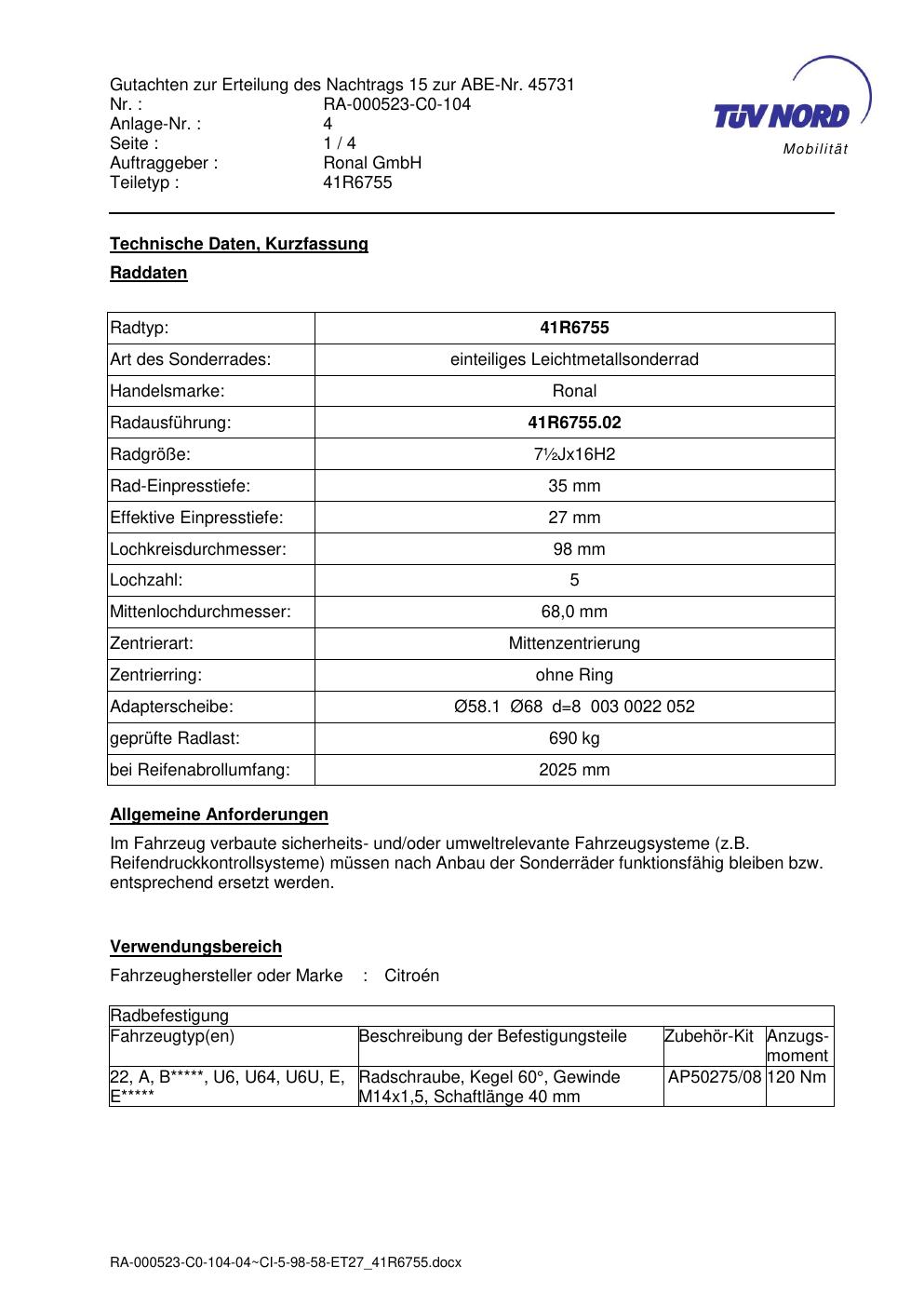 Dieses Gutachten (abe) bezieht sich auf die Alufelge brand-ronal 41R6755 in der Ausführung ET 0, Mittenloch 0 mm (KBA 45731). Im PDF findest du typischerweise zulässige Reifengrößen, Auflagen/Anbauhinweise und – je nach Dokument – Hinweise zur Eintragung.
