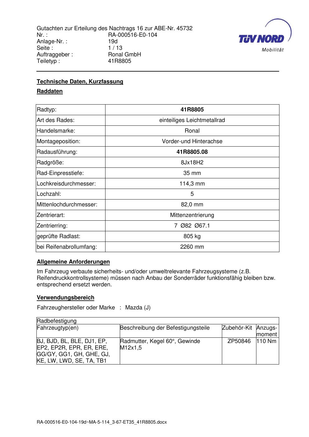 Dieses Gutachten (abe) bezieht sich auf die Alufelge brand-rial 41R8805 in der Ausführung 8Jx18 ET 0, Mittenloch 0 mm (KBA 45732). Im PDF findest du typischerweise zulässige Reifengrößen, Auflagen/Anbauhinweise und – je nach Dokument – Hinweise zur Eintragung.