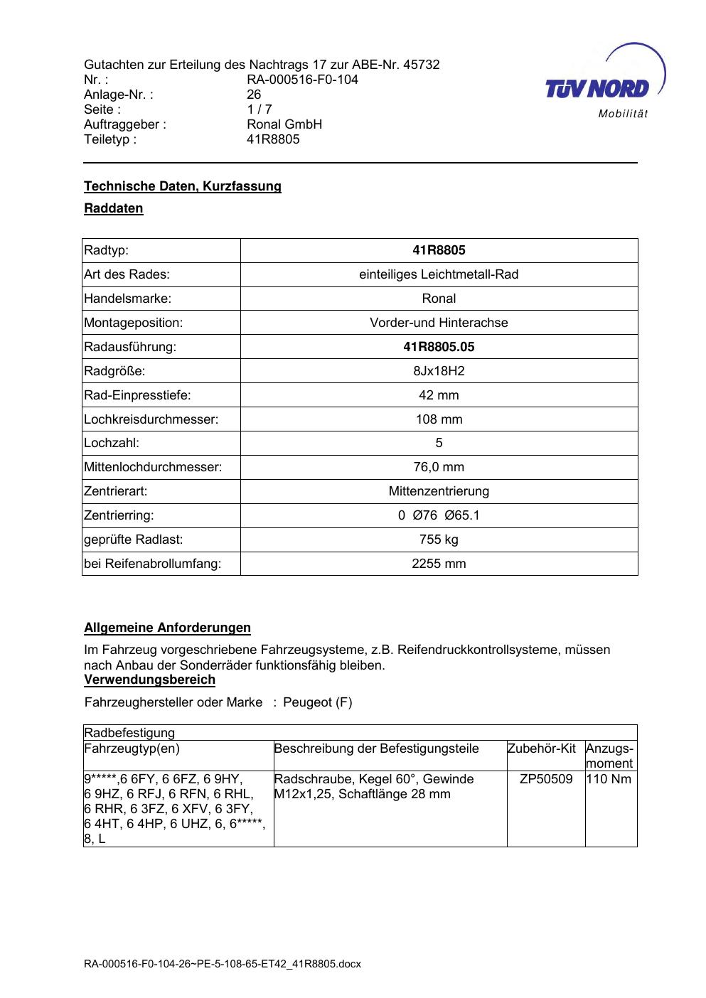 Dieses Gutachten (abe) bezieht sich auf die Alufelge brand-ronal 41R8805 in der Ausführung 8Jx18 ET 0, Mittenloch 0 mm (KBA 45732). Im PDF findest du typischerweise zulässige Reifengrößen, Auflagen/Anbauhinweise und – je nach Dokument – Hinweise zur Eintragung.