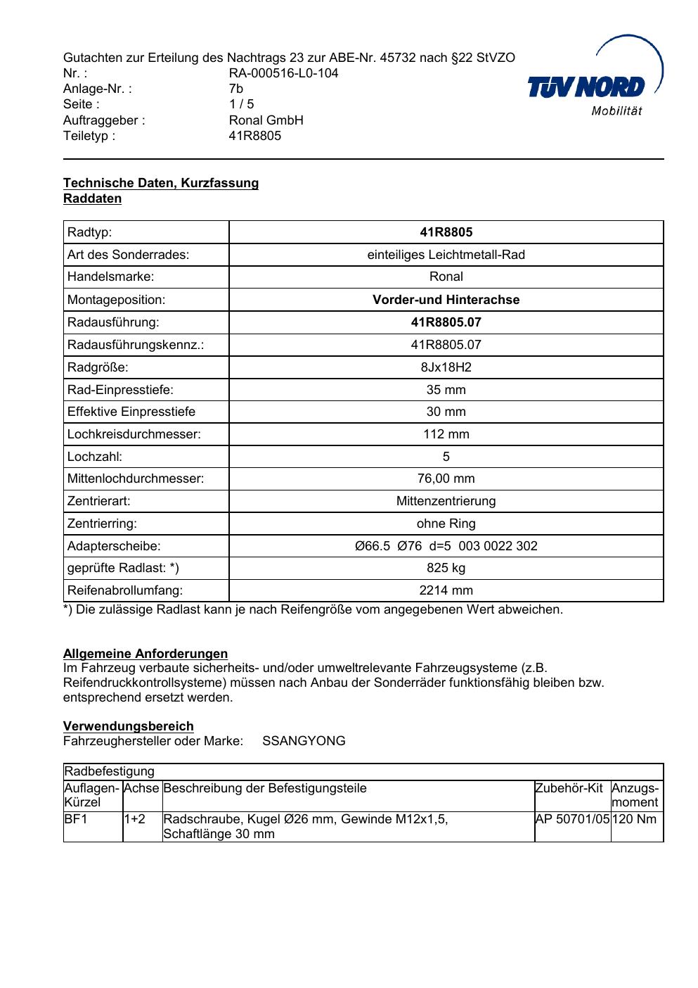 Dieses Gutachten (abe) bezieht sich auf die Alufelge brand-ronal 41R8805 in der Ausführung 8Jx18 ET 0, Mittenloch 0 mm (KBA 45732). Im PDF findest du typischerweise zulässige Reifengrößen, Auflagen/Anbauhinweise und – je nach Dokument – Hinweise zur Eintragung.