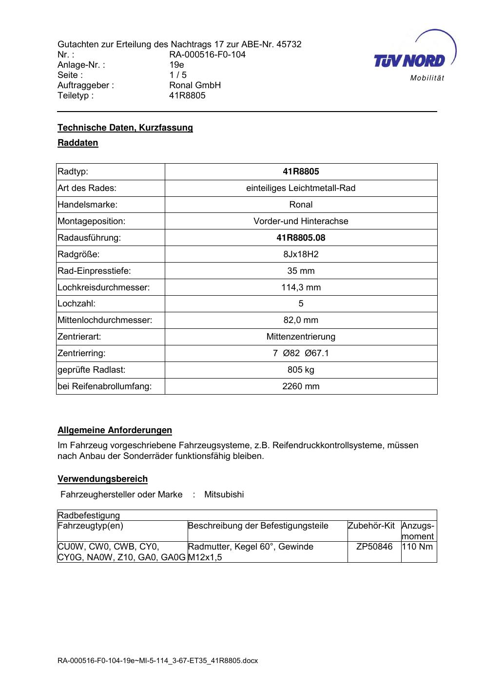 Dieses Gutachten (abe) bezieht sich auf die Alufelge brand-ronal 41R8805 in der Ausführung 8Jx18 ET 0, Mittenloch 0 mm (KBA 45732). Im PDF findest du typischerweise zulässige Reifengrößen, Auflagen/Anbauhinweise und – je nach Dokument – Hinweise zur Eintragung.
