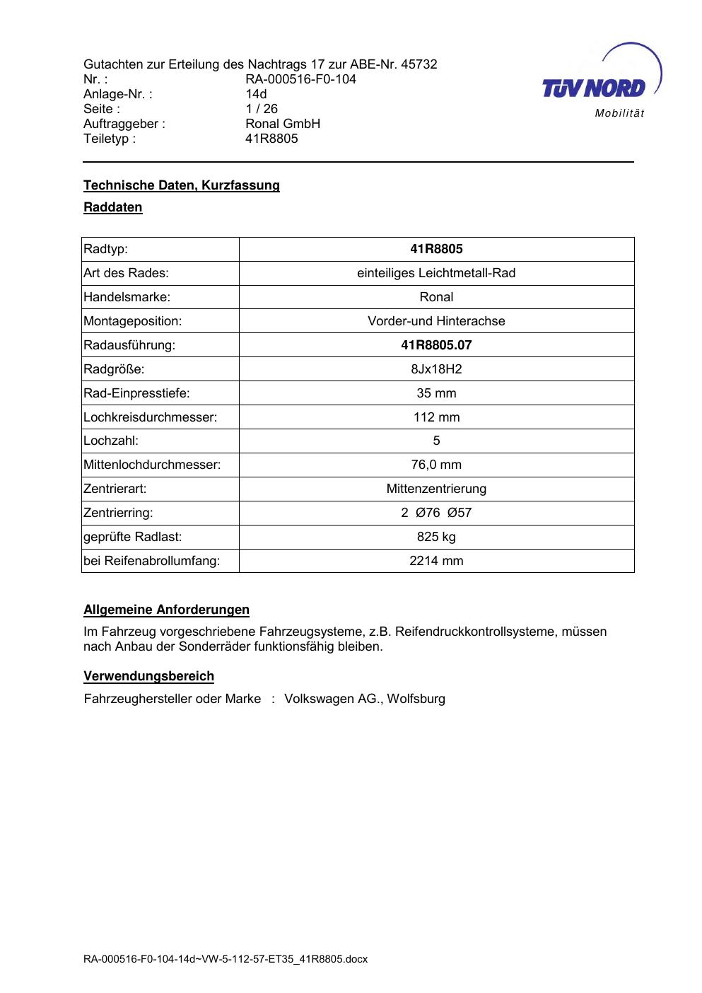 Dieses Gutachten (abe) bezieht sich auf die Alufelge brand-ronal 41R8805 in der Ausführung 8Jx18 ET 0, Mittenloch 0 mm (KBA 45732). Im PDF findest du typischerweise zulässige Reifengrößen, Auflagen/Anbauhinweise und – je nach Dokument – Hinweise zur Eintragung.
