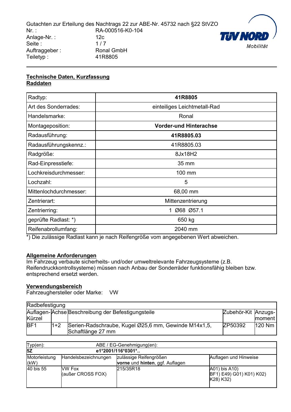 Dieses Gutachten (abe) bezieht sich auf die Alufelge brand-ronal 41R8805 in der Ausführung 8Jx18 ET 0, Mittenloch 0 mm (KBA 45732). Im PDF findest du typischerweise zulässige Reifengrößen, Auflagen/Anbauhinweise und – je nach Dokument – Hinweise zur Eintragung.