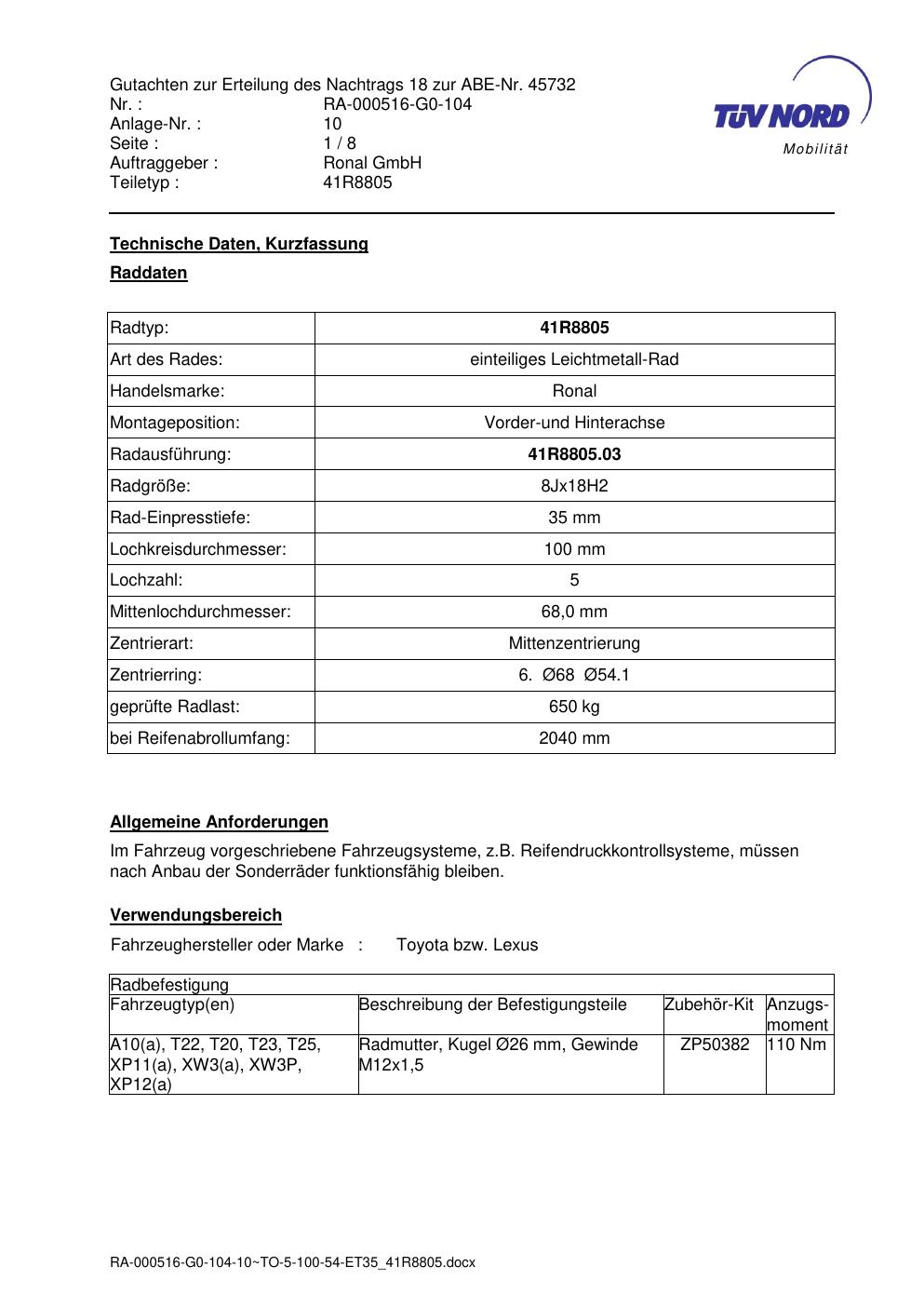 Dieses Gutachten (abe) bezieht sich auf die Alufelge brand-ronal 41R8805 in der Ausführung 8Jx18 ET 0, Mittenloch 0 mm (KBA 45732). Im PDF findest du typischerweise zulässige Reifengrößen, Auflagen/Anbauhinweise und – je nach Dokument – Hinweise zur Eintragung.