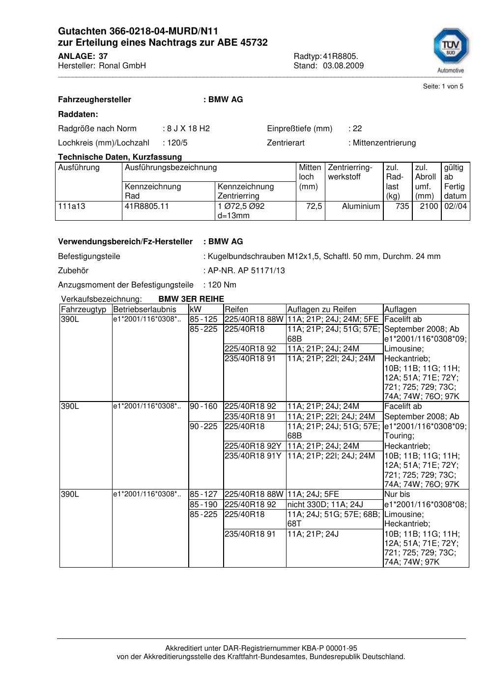 Dieses Gutachten (abe) bezieht sich auf die Alufelge brand-ronal 41R8805 in der Ausführung 8Jx18 ET 0, Mittenloch 0 mm (KBA 45732). Im PDF findest du typischerweise zulässige Reifengrößen, Auflagen/Anbauhinweise und – je nach Dokument – Hinweise zur Eintragung.