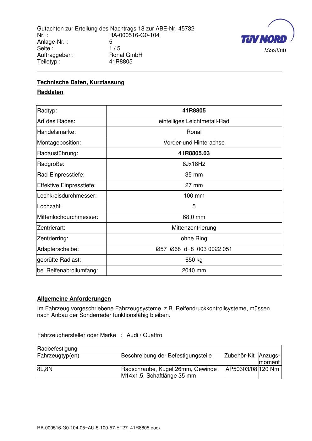 Dieses Gutachten (abe) bezieht sich auf die Alufelge brand-ronal 41R8805 in der Ausführung 8Jx18 ET 0, Mittenloch 0 mm (KBA 45732). Im PDF findest du typischerweise zulässige Reifengrößen, Auflagen/Anbauhinweise und – je nach Dokument – Hinweise zur Eintragung.